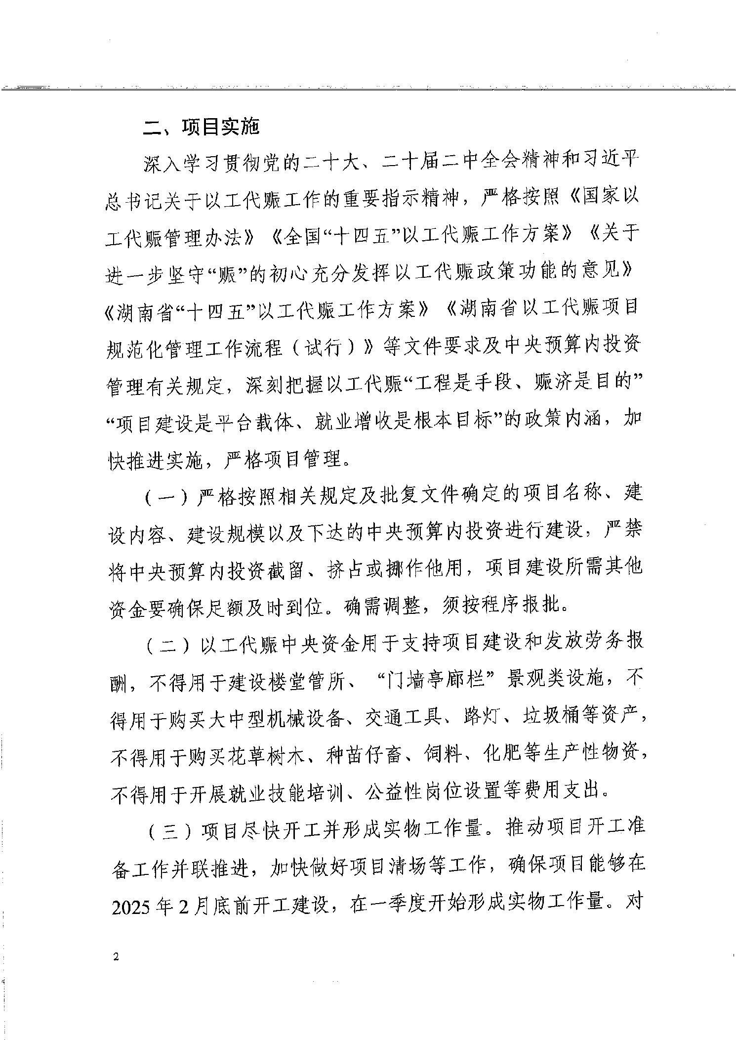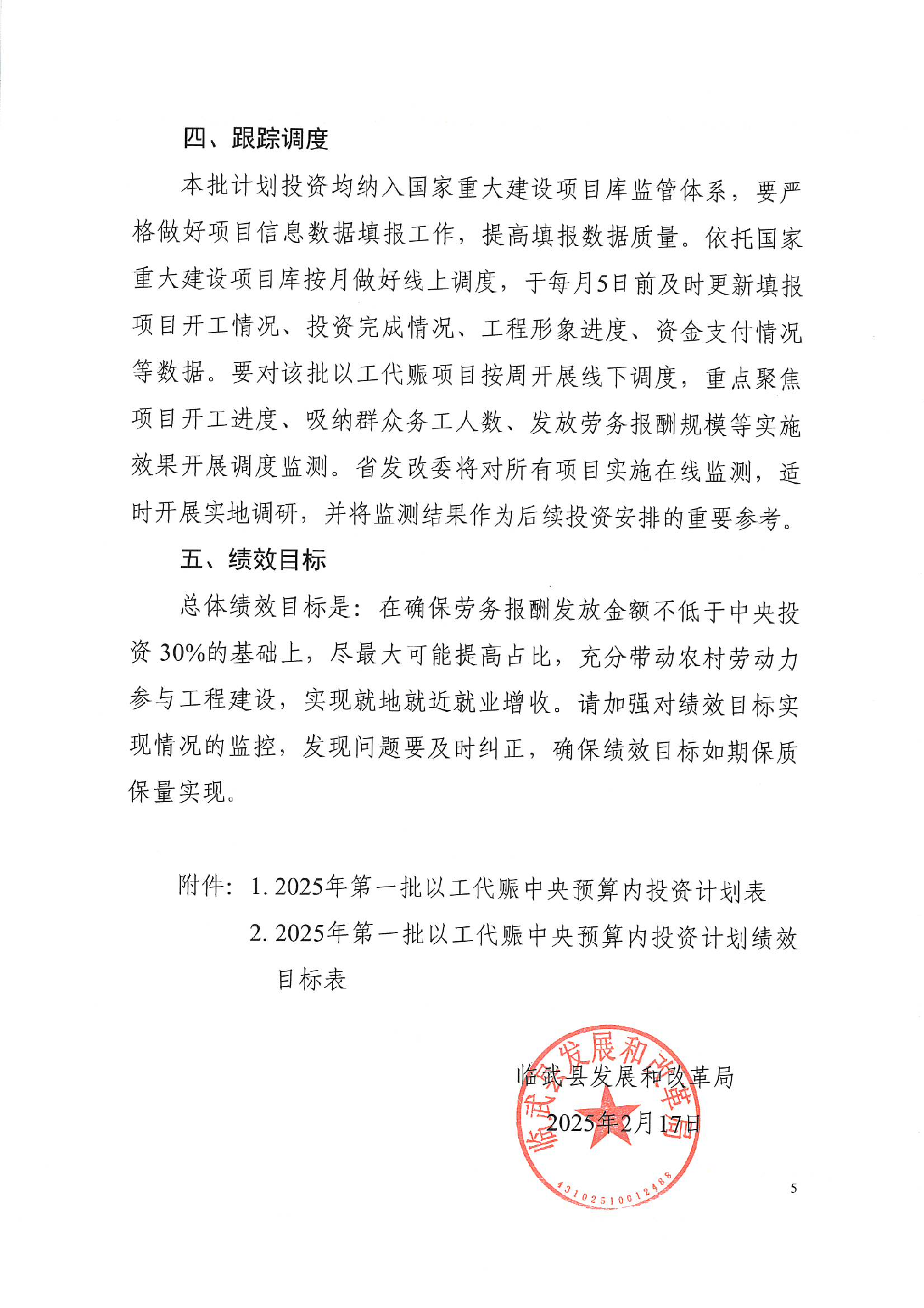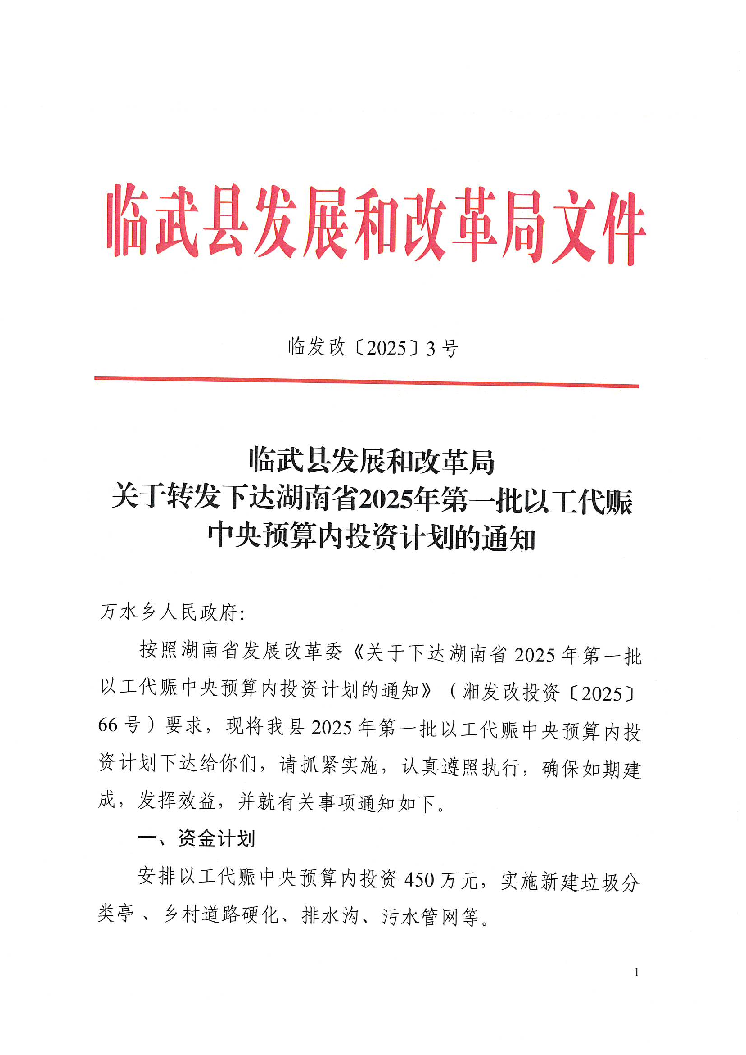 临发改〔2025〕3 号关于转发下达湖南省2025年第一批以工代赈中央预算内投资计划的通知