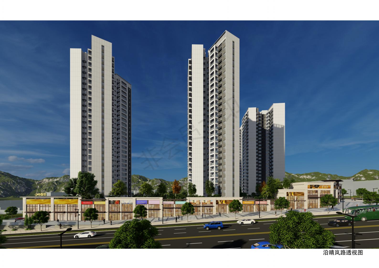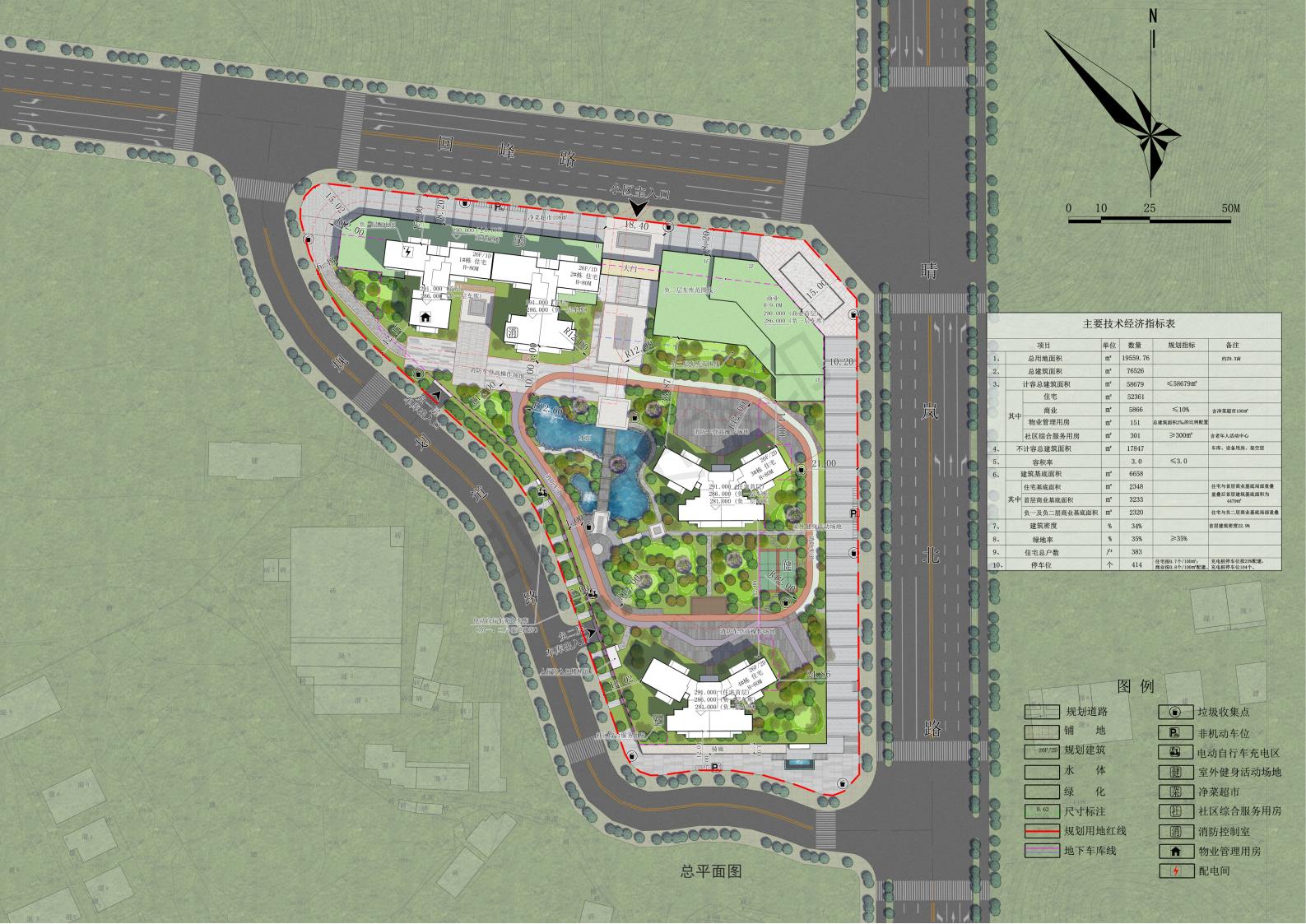 该项目位于晴岚北路与廻峰路交汇处西南面,用地性质为二类居住用地兼容商业用地(R2+B1),总用地面积19559.76㎡,容积率≤3.0,建筑密度≤34%(首层建筑密度22.9%),绿地率≥35%,建筑高度≤80米。