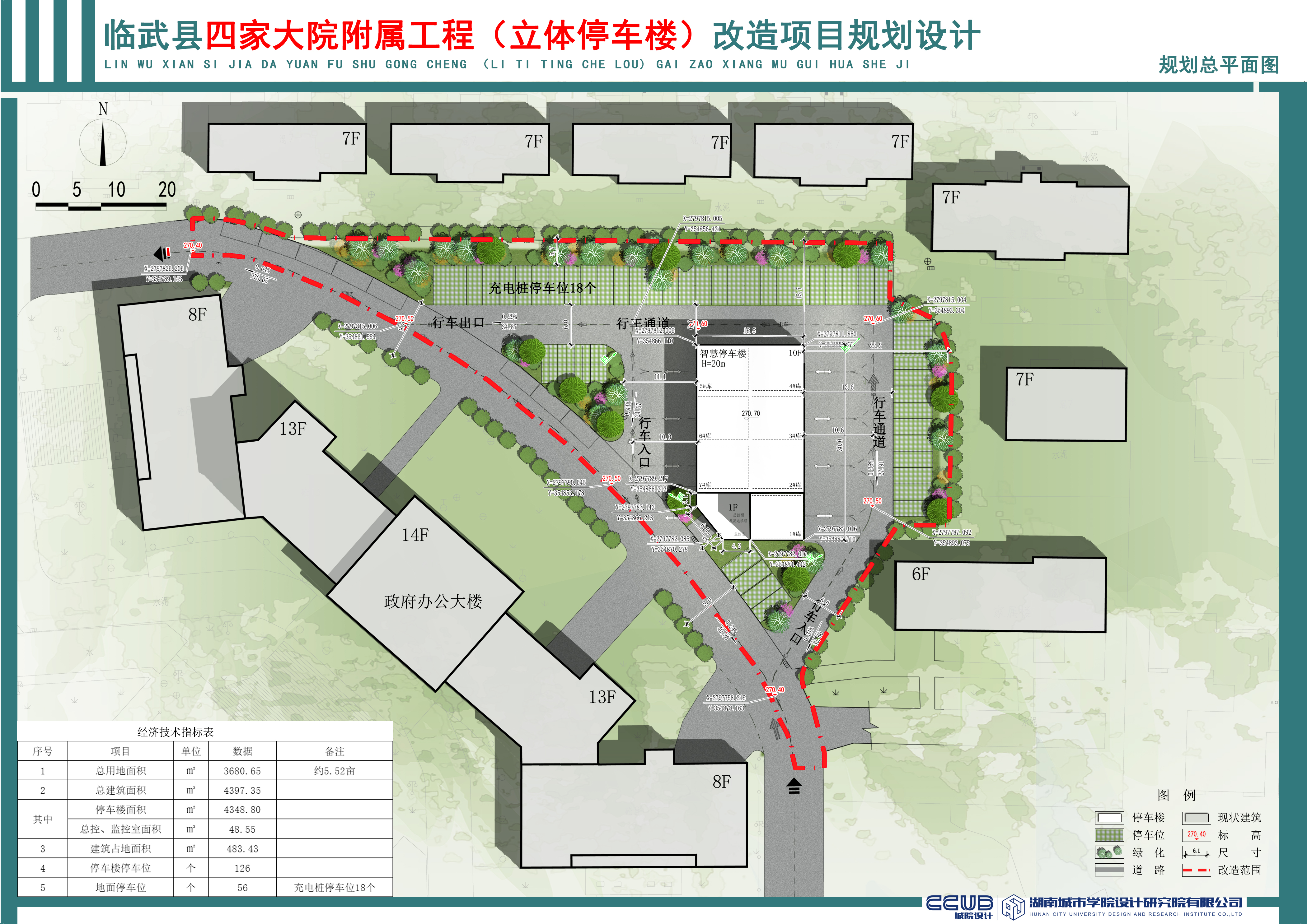 该项目位于晴岚路与临武大道交汇处东北面,改造范围总用地面积3680.65㎡,总建筑面积4397.35平方米,建筑占地面积483.43平方米,停车楼车位126个,地面停车位56个。