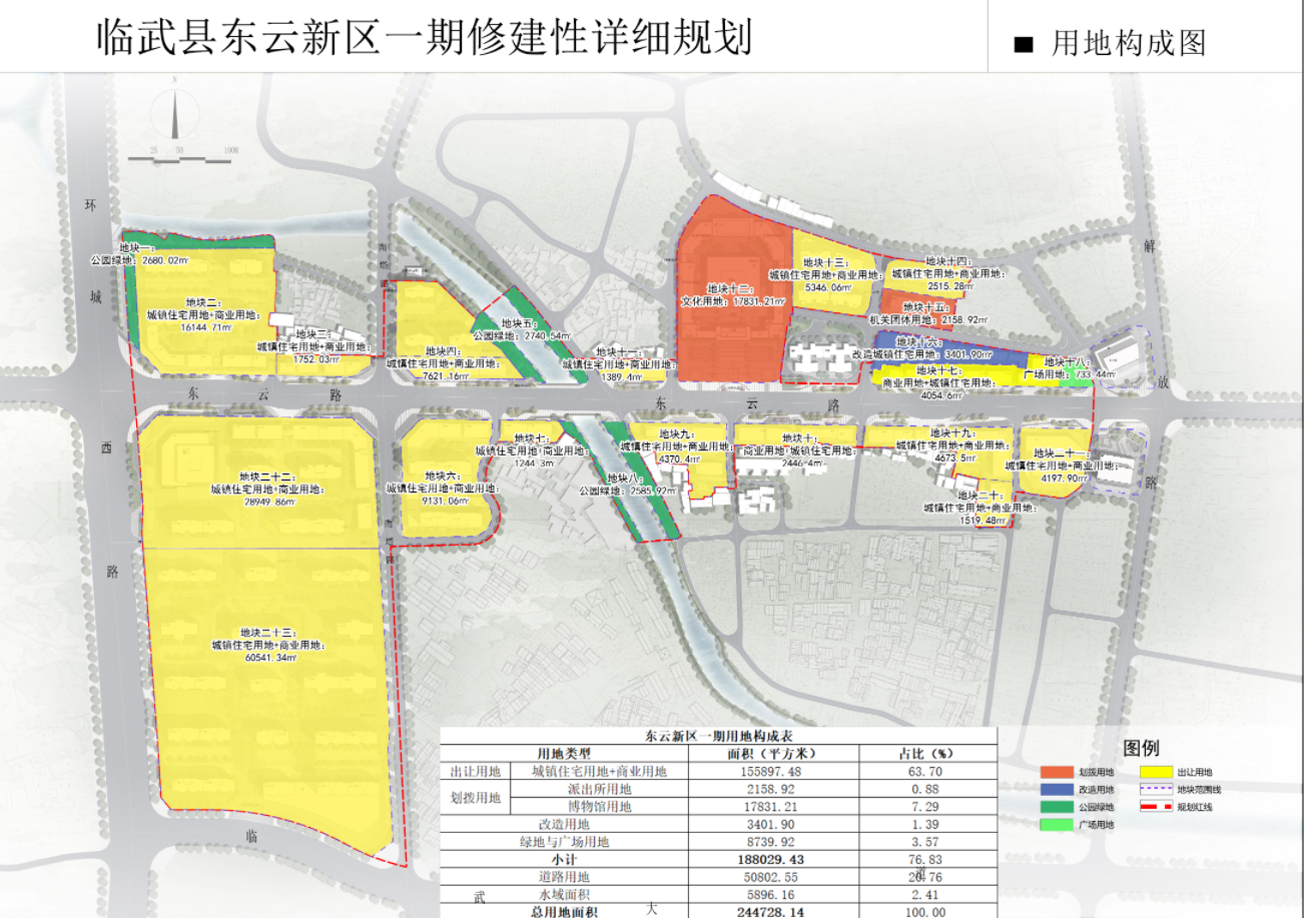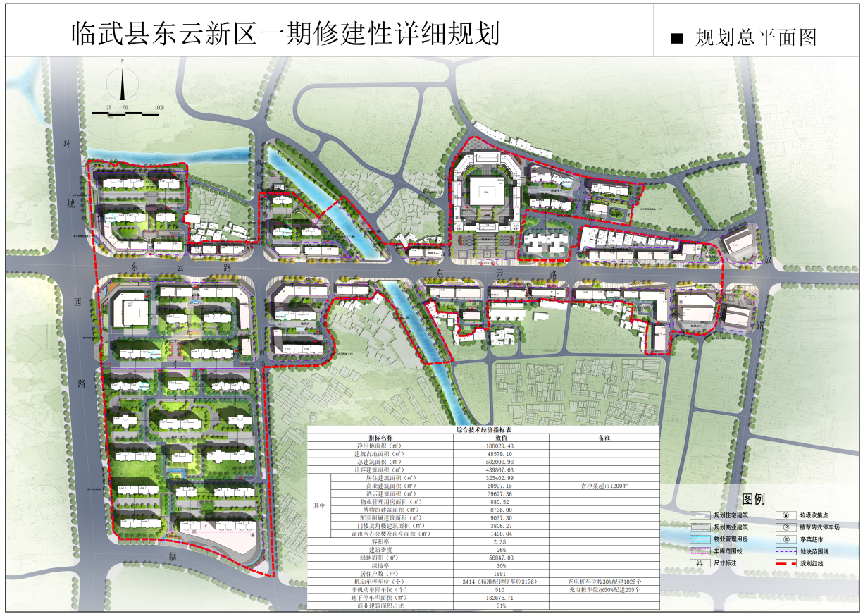 该项目位于临武县东云路延伸段,本项目规划总用地面积约188029.43㎡(约282.04亩),容积率≤2.35,建筑密度≤26%,绿地率≥30%,住宅建筑限高54米,酒店建筑限高65米,商业建筑面积比例≤21%。