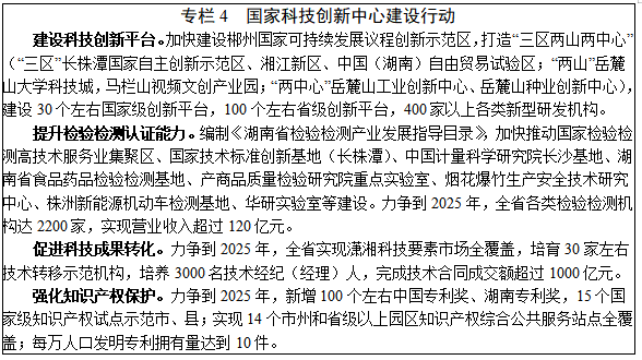 1.科技服务。围绕产业链、部署创新链、完善服务链,促进科技服务业专业化、集成化发展,构建覆盖创新全链条、产品生产全周期的科技服务体系,打造国家科技创新中心。力争到2025年,研发经费投入年均增速高于12%。提升研究开发能力。围绕我省核心产业创新与发展需求,鼓励企业开展协同研发创新,重点建设一批国家级重点实验室、技术创新中心、新型研发机构等,推动大科学装置及重大科技基础设施建设,打造湖南省科研设施和科研仪器开放共享服务平台。大力发展设计服务。重点发展工业设计、工程设计、平面设计、文化创意设计等,培育一批具有国际竞争力的设计企业,打造一批以产业集群为依托的设计产业集聚区。围绕装备制造、信息服务、消费品工业等领域,创建一批国家、省级工业设计中心和工业设计研究院,促进“湖南制造”向“湖南创造”转变。提高检验检测认证服务水平。加快推进湖南省检验检测特色产业园建设,大力发展基础检测服务,培育第三方质量安全技术服务,积极开展线上检验检测认证,发展面向设计开发、生产制造、售后服务全过程的分析、测试、检验、认证等一体化服务。完善创新创业孵化孵育功能。鼓励发展创新工场、虚拟创新社区等新型孵化平台,加快科技孵化器、众创空间、星创天地等“双创”平台建设,不断提升孵化载体专业化服务水平。提高技术转移转化率。发展技术交易、技术评估、技术投融资等服务,建设专业性、综合性、市场化的科技成果转移转化机构。推动高校、科研院所、产业联盟、工程中心等面向市场开展中试小试、技术熟化等集成服务。健全知识产权服务体系。加快知识产权交易运营机构建设,促进大数据、区块链等在知识产权保护中的运用,探索发展知识产权创造与运营的众筹、众包模式。鼓励发展科技咨询服务。开展科技评估、科技管理服务外包、项目管理外包、知识产权代理等服务,促进科技信息资源市场化开发利用。