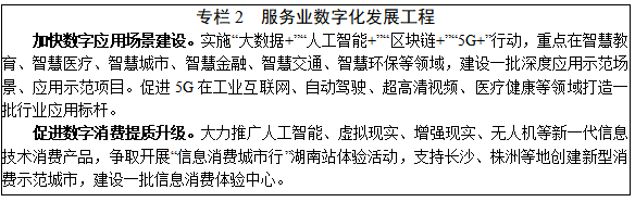 拓展服务业数字化应用。培育壮大人工智能、大数据、区块链、云计算、网络安全等新兴数字产业,重点在智慧城市、智慧工厂、智慧交通、智慧环保等领域塑造应用场景,推动典型场景和垂直行业的融合应用。开展新型智慧城市、智慧县域试点示范,建设“城市大脑”通用平台,提升城市交通、公共安全、民生服务、城市管理等智慧应用水平。发展人工智能+5G+工业互联网+产业融合创新智慧工厂应用场景,实现生产设备网络化、生产数据可视化、生产过程透明化、生产现场无人化。依托国家智能网联汽车(长沙)测试区、长株潭智能城际磁悬浮交通系统试验与示范基地,推进智能网联数据平台、智能车辆和设备研发、智能公交体系建设,着力发展智能网联汽车、智能轨道交通等应用场景。围绕洞庭湖区生态保护、矿山资源回收利用等,发展智慧旅游、智慧生态、智慧矿山应用场景,实现生态环境情况自动检测、智能监测、智能控制与智慧调度。促进共享经济、平台经济健康发展。