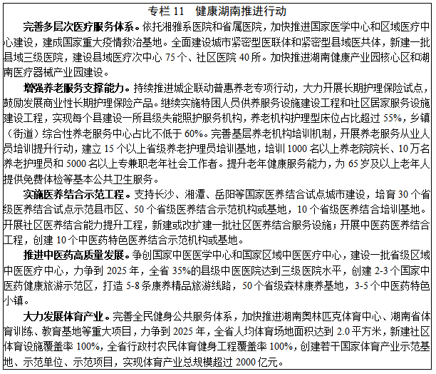8.康养服务。深入实施“健康湖南行动”,满足城乡居民多样化、差异化、个性化的健康养老服务需求。力争到2025年,基本建成服务全生命周期、结构合理、功能完善的健康服务体系,及覆盖城乡、分布均衡、惠及全民的养老服务体系。发展医疗健康服务。加快推进国家医学中心和国家区域医疗中心建设,统筹推进省级区域医疗中心和优质医疗资源扩容下沉项目建设,完善农村三级卫生服务网络和城市社区卫生机构,推进标准化乡镇卫生院建设和村卫生室改造。引导社会办医差异化发展,鼓励社会力量举办非营利性医疗机构。完善家庭医生签约服务。发展“智慧医院”,建设健康医疗大数据中心,大力推广“远程医疗”服务,探索推进可穿戴设备、智能健康电子产品和健康医疗移动应用。完善提升养老服务。支持发展普惠型养老服务,推动养老机构规模化、连锁化、品牌化发展,支持国有企业参与发展养老服务,引导社会资本投资,培育一批龙头企业、新型养老产业集团,推动培训疗养资源转型发展养老服务。完善养老服务设施,推进老旧小区适老化改造,补齐农村养老服务设施短板。发展社区居家养老服务,促进街道综合养老服务中心和带护理床位的城市社区日间照料中心全覆盖。实施医养结合示范工程和社区医养结合能力提升工程,培育一批医养结合示范机构和医养结合试点示范区,积极推进智慧健康养老应用试点示范。完善包括健康教育、预防保健、疾病诊治、康复护理、长期照护、安宁疗护的综合连续、覆盖城乡的老年健康服务体系。传承创新中医药保健服务。健全覆盖城乡的中医医疗保健服务体系,实施湖南省中医治未病健康惠民工程和中医康复服务工程。创建国家中医药综合改革示范区,建立中药材大数据服务平台,新建一批中医药文化地标,研发推广药膳、药饮、药妆、药浴等中医药保健产品,打造湖湘中医药服务品牌。发展体育健身服务。推进职业体育发展,促进体育项目协会改革和体育场馆资源所有权、经营权分离改革,引导社会力量投资建设、运营体育场所和设施。培育职业体育品牌赛事。发展运动员经纪、赛事组织、体育信息咨询等中介服务,扩大体育健身市场供给。加强公共体育服务体系建设,构建县乡村三级全民健身设施网络和城市社区15分钟健身圈。推进“江、湖、山、道”全民健身品牌活动和“一县一品”特色体育项目,打造具有区域特色的健身示范基地和产业带。培育多样化康养服务。发展森林康养、中医药健康旅游、体育医疗康复等,建设一批高水平森林康养基地,健康医疗旅游示范区。