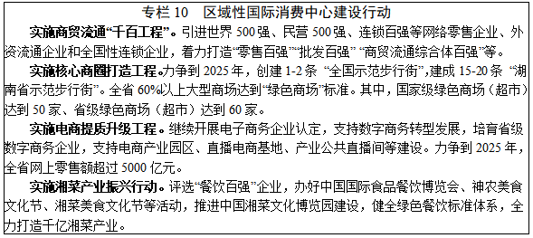 7.现代商贸。围绕打造国内大循环和国内国际双循环重要节点,积极营造放心消费环境,促进消费新业态、新模式、新场景的普及应用,打造区域性国际消费中心。力争“十四五”期间,全省社会消费品零售总额年均增长7%左右。推动零售业转型升级。加快便利店品牌化、连锁化、智能化发展,开展“湖南省示范步行街”创建,建设一批现代商业综合体、一站式大型购物中心、大型品牌折扣店等。促进新零售发展,拓展无接触、少接触消费模式,大力发展智慧超市、智慧商店等。支持长沙创建区域性国际消费中心城市。完善批发市场体系。围绕有色金属、工程机械、特色农产品等优势产业,打造辐射中西部、影响全国的区域批发市场。鼓励商贸市场跨行业、跨领域融合发展,增强信息、交易、加工、配送、融资、担保等一体化综合服务能力。促进住宿业提档升级。培养闲暇经济和度假文化,引进国内外高端酒店品牌和管理公司,提升住宿业标准水平。发展具有湖湘文化、民族地域特色的民宿酒店,促进经济型酒店品牌化、连锁化、集团化发展。做大做强餐饮业。推进餐饮业连锁化经营,发展中央厨房,拓展在线订餐、美食鉴赏、顾客点评等服务功能。实施湘菜产业振兴行动,开发新派湘菜,传承湘菜名品,打造具有湖南特色的地方名店、名菜、名小吃等美食名片,推动湘菜出湘。促进电商创新发展。加快发展跨境电商、农村电商、社区电商、工业电商、生鲜电商、直播电商等新模式。完善农村电商服务体系,开展“数商兴农”行动,壮大网销“一县一品”品牌,持续推动农产品上行,提升农村电商与快递物流协同发展水平。全面推进长沙、湘潭、岳阳、郴州等跨境电子商务综合试验区建设。推动电子商务领域信用记录共建共享,完善市场化信用评价体系。扩大特色消费市场。促进 “银发经济”“她经济”“童经济”“夜经济”发展,打造老人、女性、儿童友好的消费空间,充分挖掘夜间观光、娱乐、餐饮资源,重点打造“长沙夜星城”全国品牌,培育特色精品的夜间消费功能区和示范区。