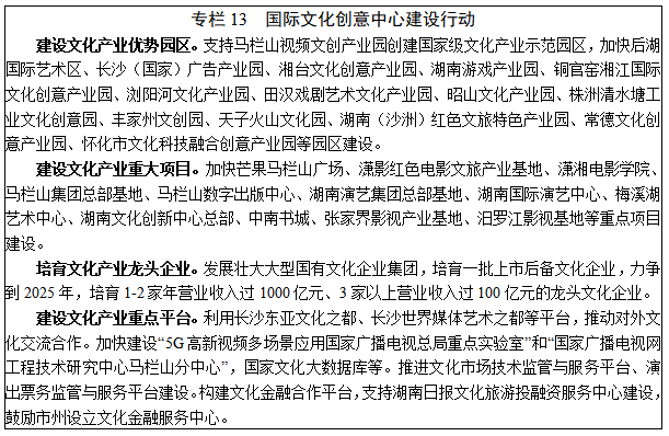 10.文化产业。遵循“守正创新”发展理念,挖掘湖湘特色文化,大力发展数字文化产业,扩大文化产品和服务供给,打造具有国际影响力的文化创意中心。力争到2025年,全省规模以上文化企业数量达到5000家,营业收入达到5000亿元。巩固影视传媒业优势地位。全面提升电视剧、综艺节目、纪录片等传统节目质量,开发竖屏节目、互动节目、沉浸式节目等新兴视频节目,做强以湖南卫视为主的电视媒体,推动“数字湖南·智慧广电”建设,加快发展高新视频内容产业,着力打造马栏山国家5G高新视频内容产业核心基地。提升电影制作、发行、播映和开发能力。加快新闻出版业转型发展。做大做强湘版图书品牌,推进IP全版权运营,提升编、印、发、供全流程融合化、数字化、智能化水平,推进实体书店信息化升级和改造。促进演艺娱乐业提质升级。支持具有湘情湘味的戏曲、民乐、杂技等演艺作品演出,提质升级旅游景点演艺节目,扶持大型演艺机构建设文化艺术经营综合体,深度布局艺术生产、制作、宣传、票务销售、演出场所等全产业链。鼓励动漫游戏业创新发展。支持湖湘原创漫画、影视动画、网络动漫、手机动漫等开发,加快动漫游戏、虚拟仿真及衍生产品服务的拓展应用,加强动漫游戏关键技术研发,打造一批动漫游戏原创作品。开发湖湘特色文化资源。深入挖掘红色文化、湘商文化、书院文化价值,拓展《湖湘文库》的利用价值。保护传承少数民族特色文化,加强对民间文学、民俗文化、民间音乐舞蹈戏曲的保护,扶持民族民间文化社团组织发展,打造一批民间文化艺术之乡。鼓励合理利用文物和非物质文化遗产资源进行文艺创作和文创设计,开发相关文创产品,重点推进湘绣、湘瓷、湘茶、烟花等提质升级。发展数字文化产业。推动文化旅游、演艺娱乐、文博会展、广播电视等行业数字化转型,培育数字电影、网络游戏、数字音乐、数字出版、网络视听等新兴产业,促进网络文学、网络音乐、网络演出、网络自制剧、微电影、短视频、直播作品等新兴文化作品繁荣有序发展。依托优势文化产业园区,建设一批数字文化产业集群。