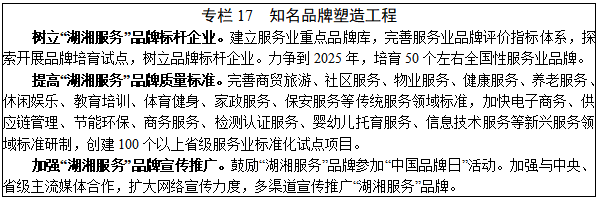 培育“湖湘服务”品牌。推动行业协会、第三方机构开展服务品牌培育和塑造,研究建立服务品牌培育和评价体系。加强对服务业企业的品牌孵化,培育形成一批拥有自主知识产权和核心竞争力的品牌企业,争创“中国质量奖”“中华老字号”“省长质量奖”。开展品牌价值评价,确立品牌无形资产的地位,提升品牌价值和效应。强化服务品牌保护,严厉打击查处侵权假冒服务品牌行为。加强湖南服务品牌宣传、推广力度,扩大 “湖南老字号”品牌队伍,提升“锦绣潇湘”、文化湘军品牌影响力,打造具有国际知名度的“湖湘服务”品牌。