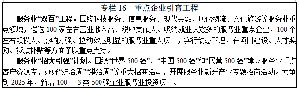引进培育头部企业。实施“招大引强”计划,建立服务业重点企业招商目录,瞄准“世界500强”“中国500强”“民营500强”服务业企业,大型湘商企业和大型央企,组织专题招商,引进一批服务业龙头企业总部、地区总部、分支机构、研发中心、采购中心、数据中心等。建立湖南本土服务业重点企业名录,集中市场、技术、人才和资金等,“一企一策”重点扶持,培育一批营业收入过100亿元、50亿元的本土服务业龙头企业和“中国服务业企业500强”。支持产业关联度大、技术服务能力强的头部企业向平台型和供应链企业转型,带动上下游关联产业集聚发展。