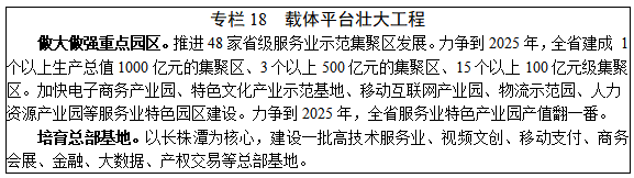 ——平台载体建设加快,集聚发展成效凸显。创建省级服务业示范集聚区48家,实现产值超5000亿元,新建了马栏山视频文创产业园、湖南省检验检测特色产业园、中国长沙人力资源服务产业园等国家级园区。设立潇湘科技要素市场,新增国家重点实验室、工程技术研究中心、企业技术中心34家,认定科技企业孵化器、众创空间、星创天地等近500家。湖南金融中心和湘江基金小镇建设初具规模。举办了国际矿物宝石博览会、国际食品餐饮博览会、世界计算机大会等品牌展会。
