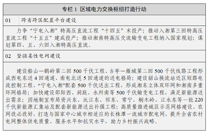 (二)打造跨省跨区电力优化配置中枢。充分发挥湖南作为东部沿海地区和中西部地区过渡带、长江开放经济带和沿海开放经济带结合部的区位优势,紧密结合全国电力流向新格局,打造中南地区电力资源大范围优化配置的集散中枢。加强与甘肃、四川、宁夏等送端省份联系,推动送端配套电源和受端承载能力建设,确保祁韶直流安全运行、稳送满送,雅湖直流足额分电湖南,“宁电入湘”建成投产,积极争取三峡清洁水电更多分电湖南,争取贵州等周边省份清洁能源点对网送湘,稳步提升现有通道可再生能源电量送入水平,确保跨省跨区输电通道可再生能源电量占比不低于50%并逐步提升。抢抓国家大型清洁能源集中开发机遇期,加大与北部、西部、沿海清洁能源基地合作力度,力争第三回直流“十五五”期间投产,超前谋划第四、五、六回直流入湘工程,提前预留新增输电通道路由条件,做好站址保护。推动完善华中特高压交流环网,适时投产湘南特高压交流输变电工程,新增湘南—江西赣州跨省特高压交流通道,加强湘、鄂、豫、赣四省交流联络,积极推动与南方电网异步互联,力争湘粤背靠背柔性直流互联工程“十五五”期间投产,推动湖南由国网末端转为国家电网与南方电网柔性互济、合作运行的“桥头堡”,打造全国电力流西电东送区域中继站和南北互济区域联络站。