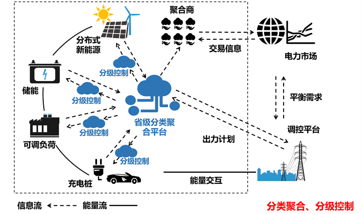 (十五)推动源网荷储电力资源分类分级聚合。基于统一的数字底座、物联采集与实时量测中心等技术架构,建立和完善省级源网荷储分类聚合平台,通过统一平台对源网荷储四侧资源分散聚合控制,实现电力系统分层分级的综合动态平衡。开展源网荷储分类分级聚合顶层设计,研究制定分类分级聚合的技术路径和实施方案。推动分布式光伏运营监测平台、配电监控系统的升级改造和分级应用,实现对分布式光伏的“刚性控”“柔性控”“群调群控”等多场景灵活控制。完善常规中小电源聚合平台,调动中小电源深度聚合的积极性,提升中小电源统一调度能力,实现广域协同、灵活互动。深化建设新型负荷管理平台,提升新型负荷管理系统智能化、实用化水平,对负荷资源分层分类统一管理、统一调控、统一服务。建设用户侧储能监控平台,分级分类接入用户侧储能电站数据,实现海量用户侧储能资源更大范围的共享互济和优化配置。建立适应源网荷储分类分级聚合的调度模式和交易机制,贯穿省、市、县三级调度系统,制定并网管理、运行控制相关标准规范,完善清洁能源、需求侧资源和储能参与电力市场的机制,依托统一的信息共享和技术支持平台,培育多类型聚合商参与分层分级聚合调度。构建基于电网一张图的新型电力系统全要素数字底座,开展新型电力系统各要素承载力的可视化推演计算,实现配网各环节、各业务以及新要素的全面图上管控,提升分布式资源消纳能力。