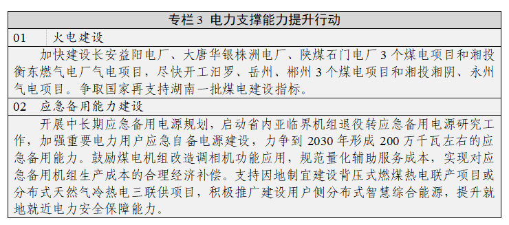 (七)夯实保障性电源基础。充分发挥火电作为电力安全保障“压舱石”作用,稳住火电供应基本盘,合理保障火电装机裕度,逐步推动火电向基础保障性和系统调节性电源并重方向转型发展。重点围绕铁路、水运运煤通道沿线、湘南负荷中心、特高压落点等电网重要节点,按照“先立后破、不增新址”的原则,优化布局一批火电项目,持续优化电源结构。确保新建煤电机组以百万千瓦级超超临界机组为主,加速百万千瓦级绿色煤电机组对老旧低效机组的更新迭代,推动煤电清洁低碳化发展。在气源有保障、气价可承受、调峰需求大的负荷中心适度发展一批调峰气电项目。加快开展新型节能降碳技术、燃煤耦合生物质发电、CCUS、提质降碳燃烧、燃气机组掺氢燃烧联合循环、整体煤气化蒸汽燃气联合循环发电(IGCC)、超临界CO2(S-CO2)发电技术研发及全流程系统集成和示范应用,实现火电出力清洁、高效、灵活化。有序推动火电机组由提供电力电量逐步转为提供应急保障和备用容量,承担新型电力系统基础保障责任。