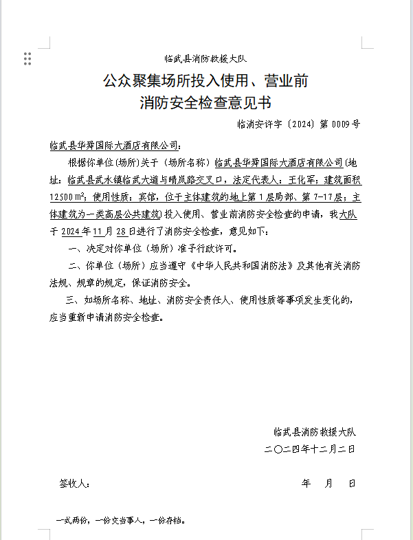 临武县华舜国际大酒店有限公司公众聚集场所投入使用、营业前消防安全检查意见书