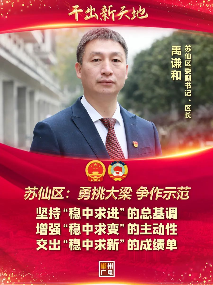 苏仙区委副书记、区长 禹谦和:紧扣“城市会客厅、开放排头兵、科教主阵地、文旅新地标”目标定位,加快新型工业、商贸商圈、科教强区、旅游产业、城市经济、乡村振兴、民生事业、财源建设、平台发展、社会治理等“十大建设”,大力发展新质生产力,兴工旺商、优教强旅,努力在全市挑大梁、争排头、作示范。