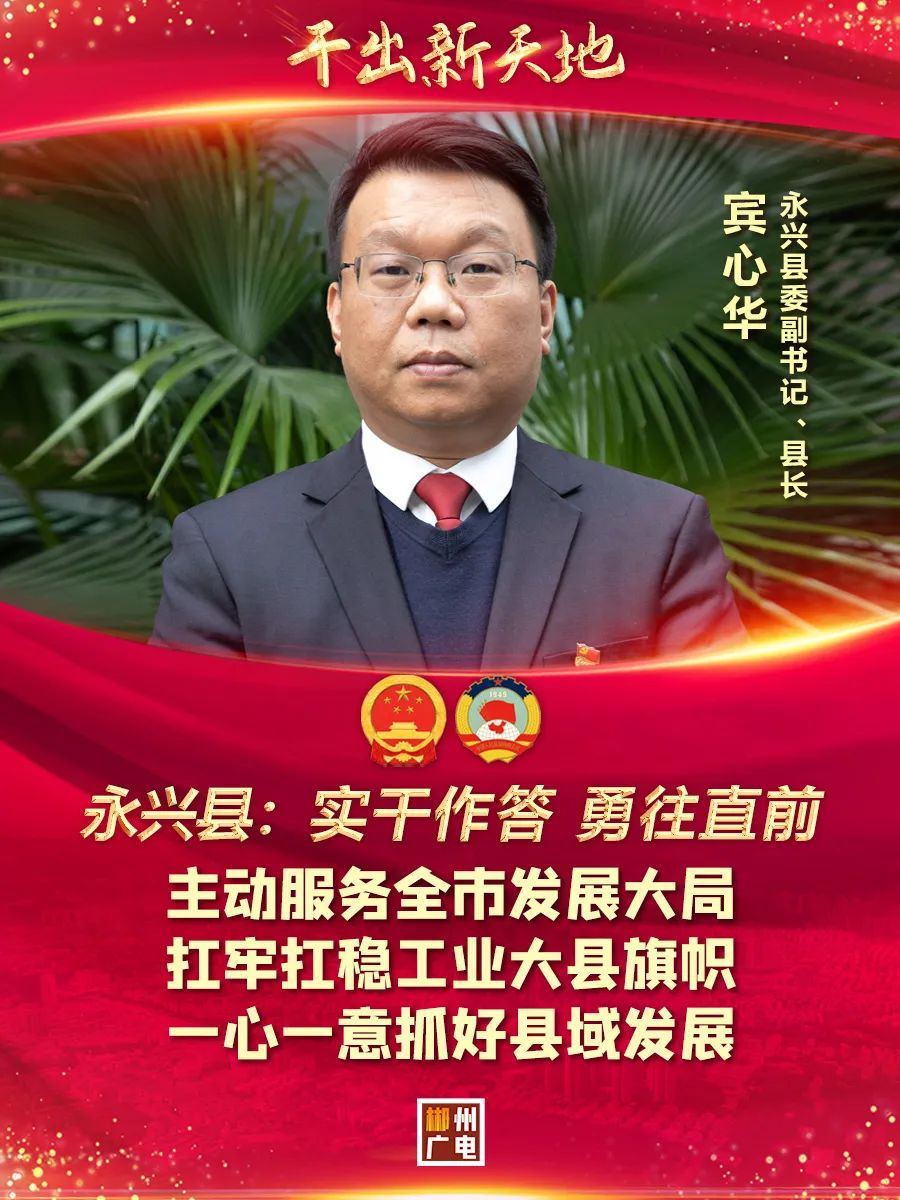 永兴县委副书记、县长 宾心华:咬定主要经济指标高于全市预期目标,为全市稳增长贡献经济大县力量。锚定在全国工业体系占据战略地位的目标定位,坚持立体推动“一主一特多强”的工业体系建设。大力推动稀贵金属综合回收利用产业提质升级、绿色转型,全力打造国家循环产业基地、全国稀贵金属新材料基地。因地制宜发展特色县域经济,推动新型城镇化和乡村全面振兴融合发展。