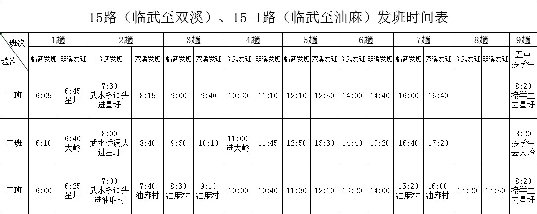 以上是15路双溪线公交车时间表,另外可以关注我们郴汽集团的微信公众号,里面可以查询实时公交,偶尔出现特殊情况压班也可以拨打我们调度办公室电话询问公交班次0735-6355618。