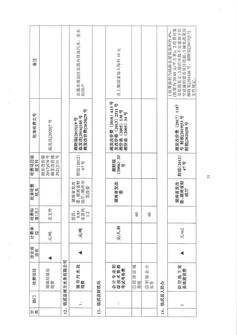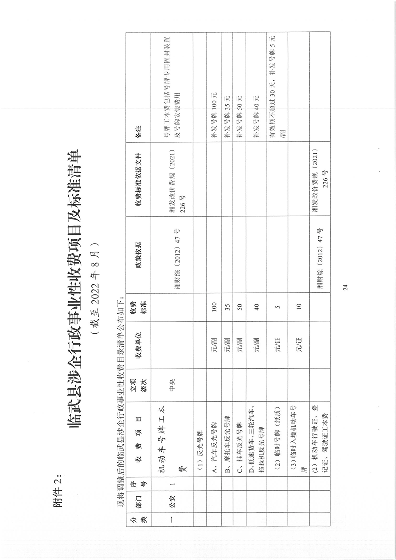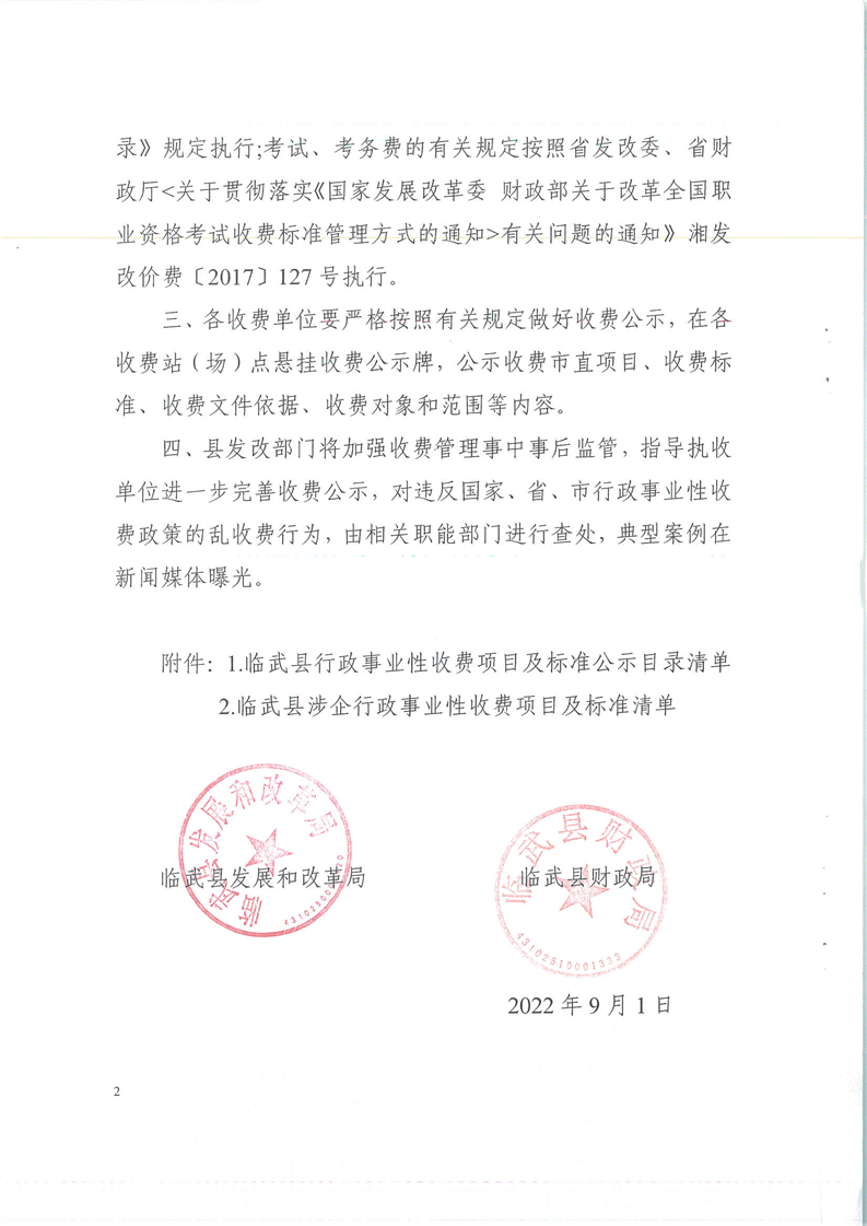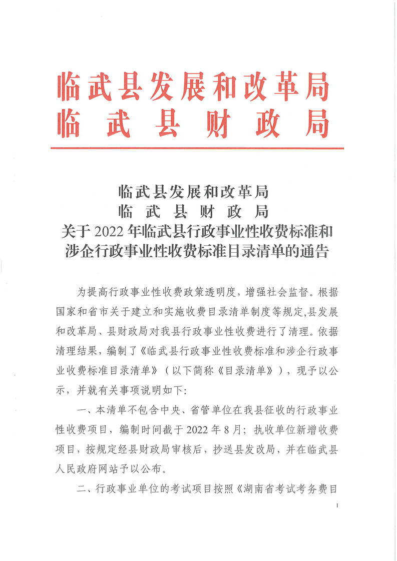 关于2022年临武县行政事业性收费标准和涉企行政事业性收费标准目录清单的通告