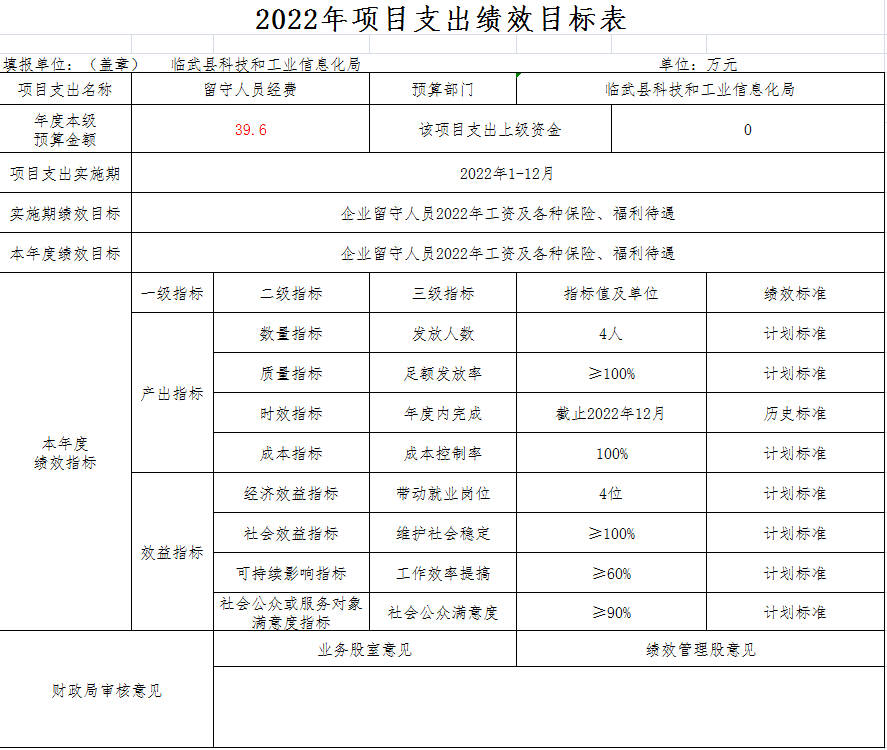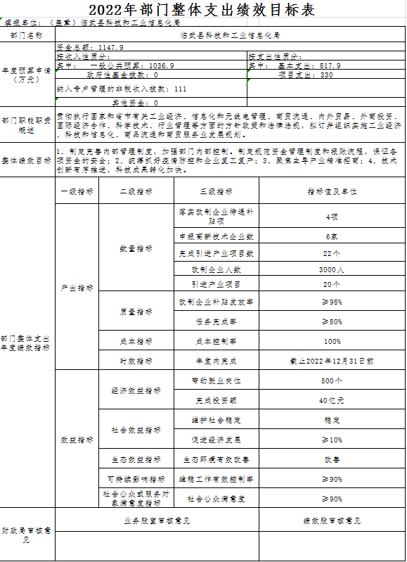 2022年临武县科技和工业信息化局整体支出绩效目标表