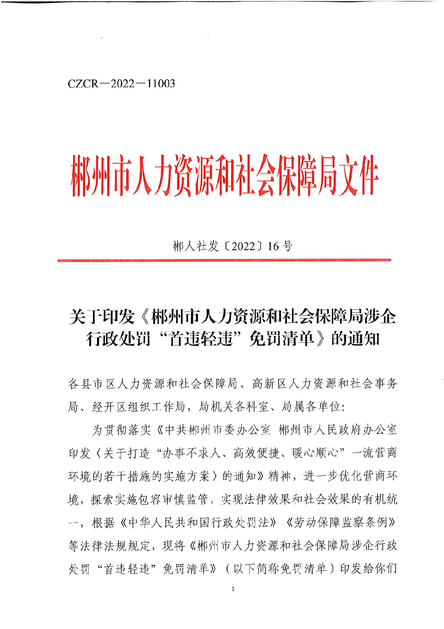 关于印发《郴州市人力资源和社会保障局涉企行政处罚“首违轻违”免罚清单》的通知