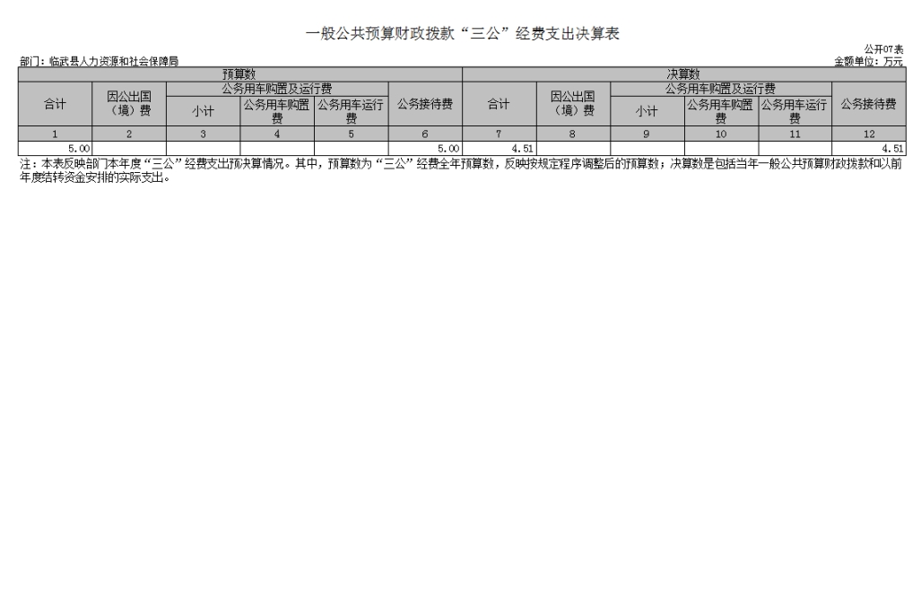 “三公”经费财政拨款支出预算为5.00万元,支出决算为4.51万元,完成预算的90.2%,其中:
