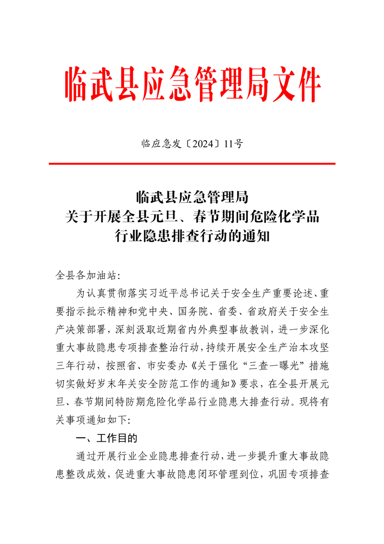 临应急发〔2024〕11号 临武县应急管理局关于开展全县元旦、春节期间危险化学品行业隐患排查行动的通知