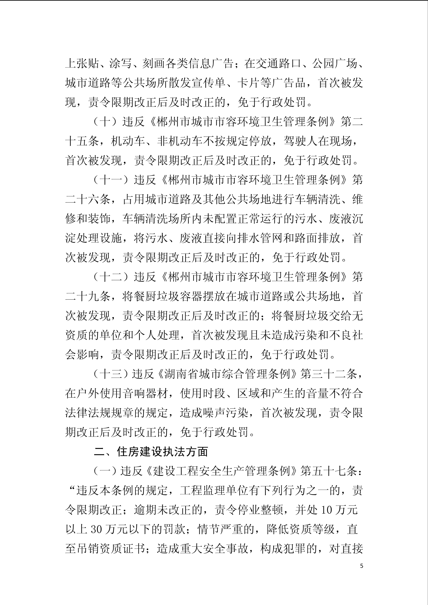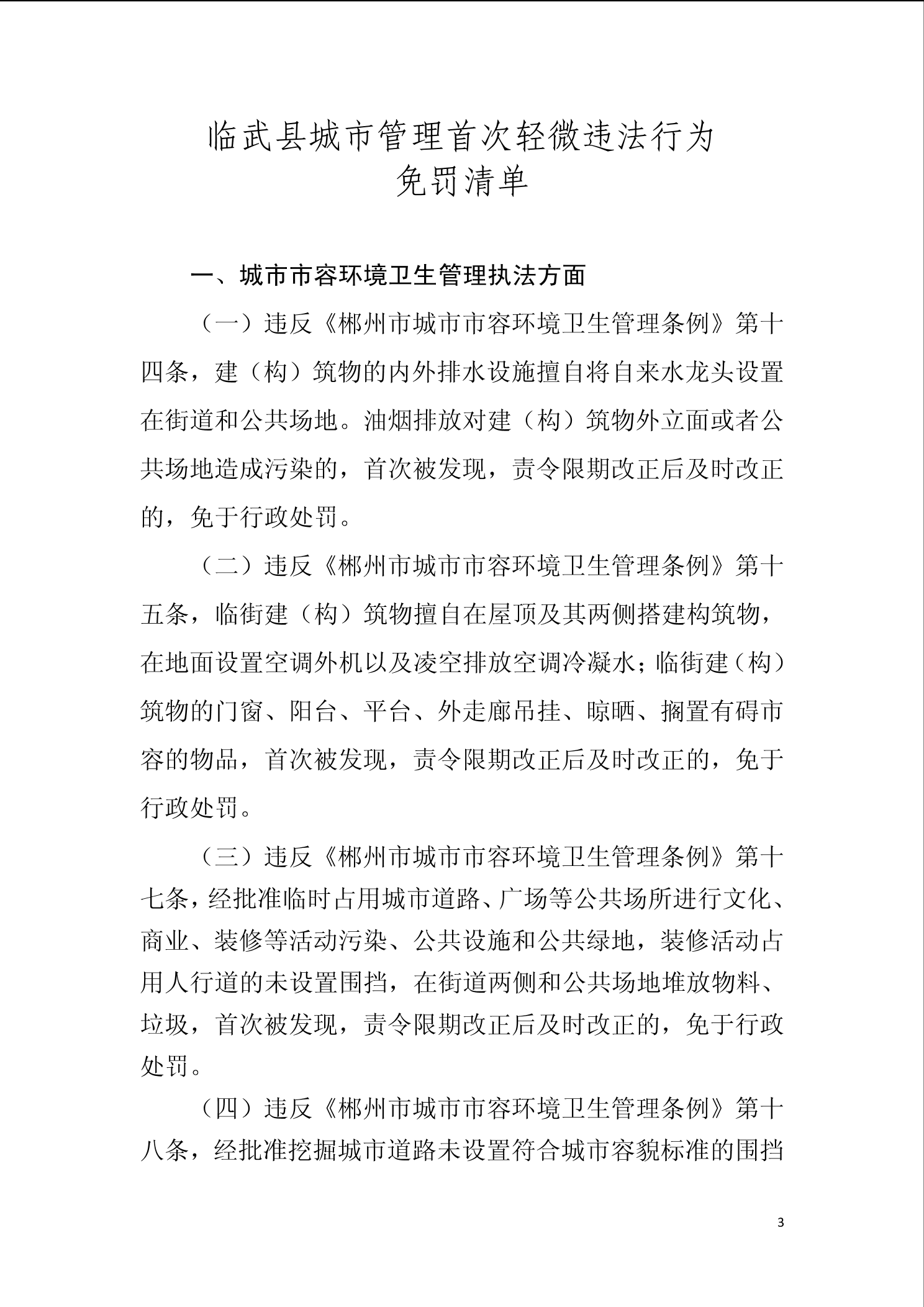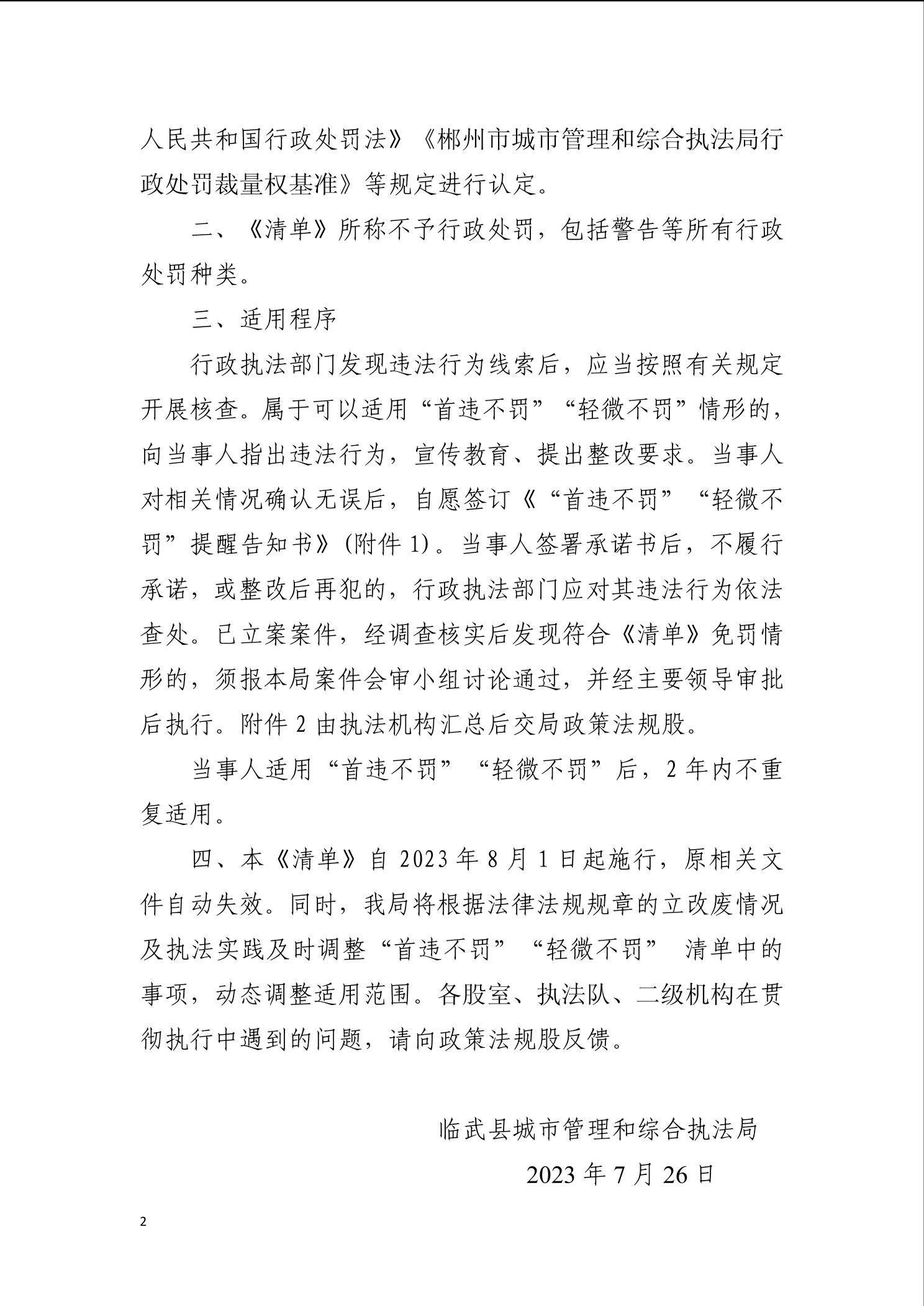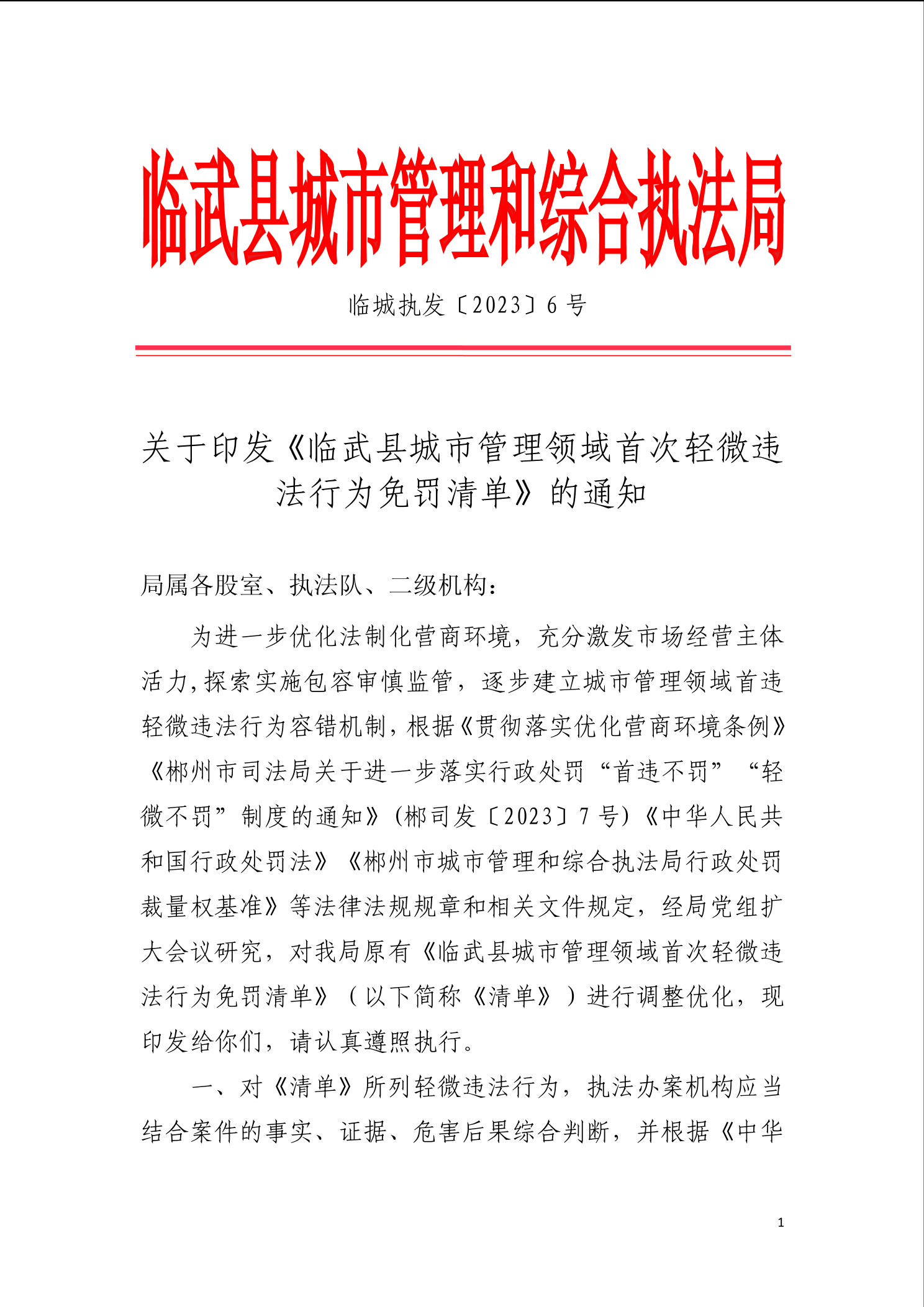 临城执发〔2023〕6号关于印发《临武县城市管理领域首次轻微违法行为免罚清单》的通知