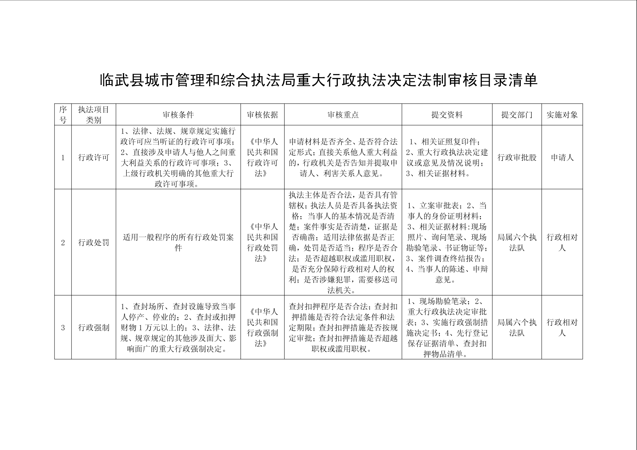 城管局重大行政执法决定法制审核目录清单
