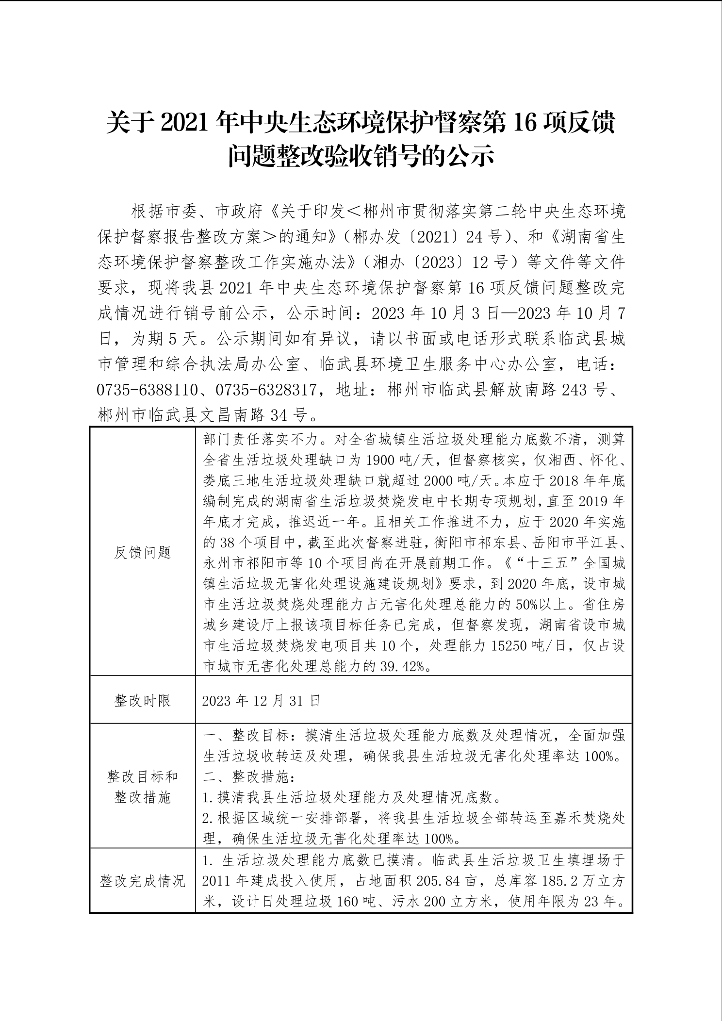 关于2021年中央生态环境保护督察第16项反馈问题整改验收销号的公示