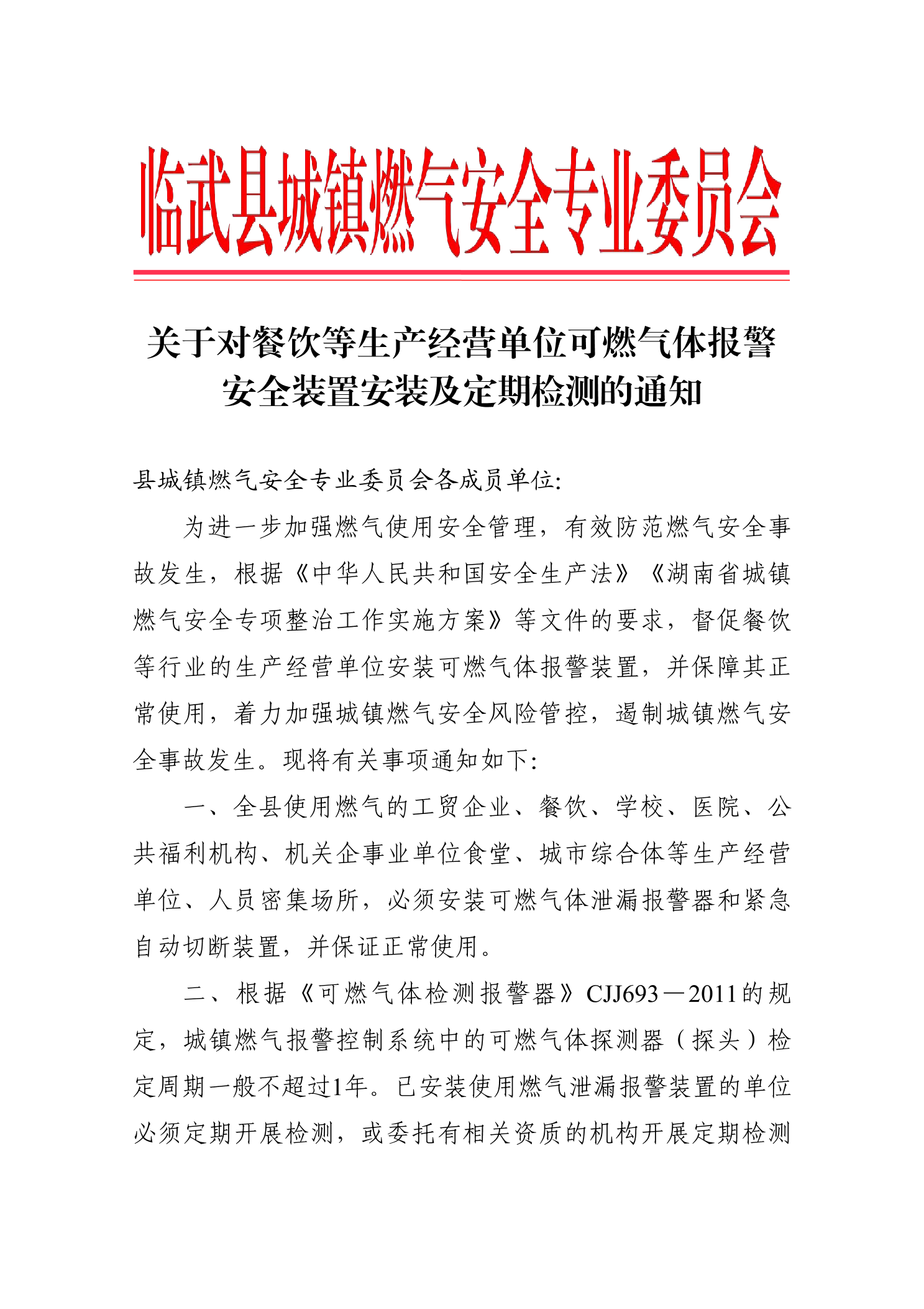 关于对餐饮等生产经营单位可燃气体报警安全装置安装及定期检测的通知