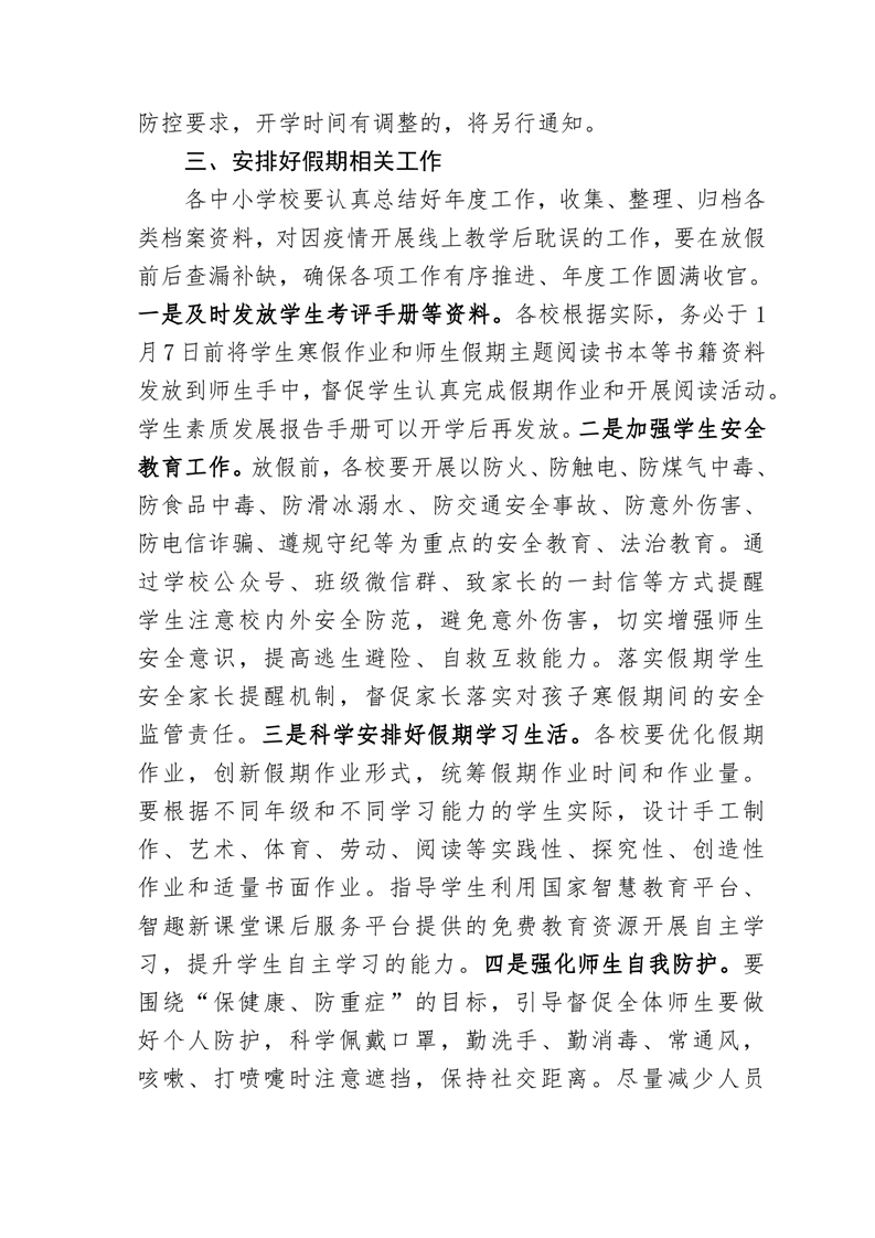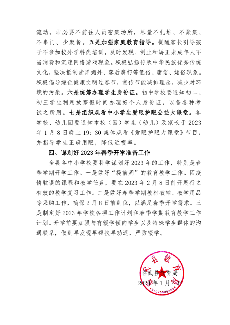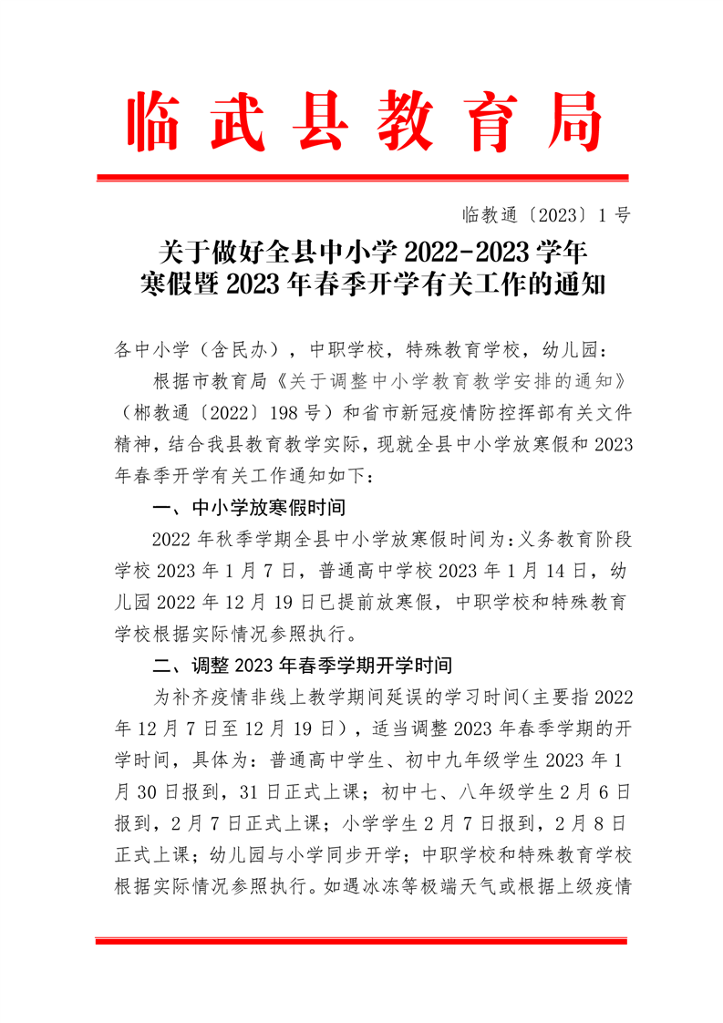 关于做好全县中小学2022-2023学年寒假暨2023年春季开学有关工作的通知