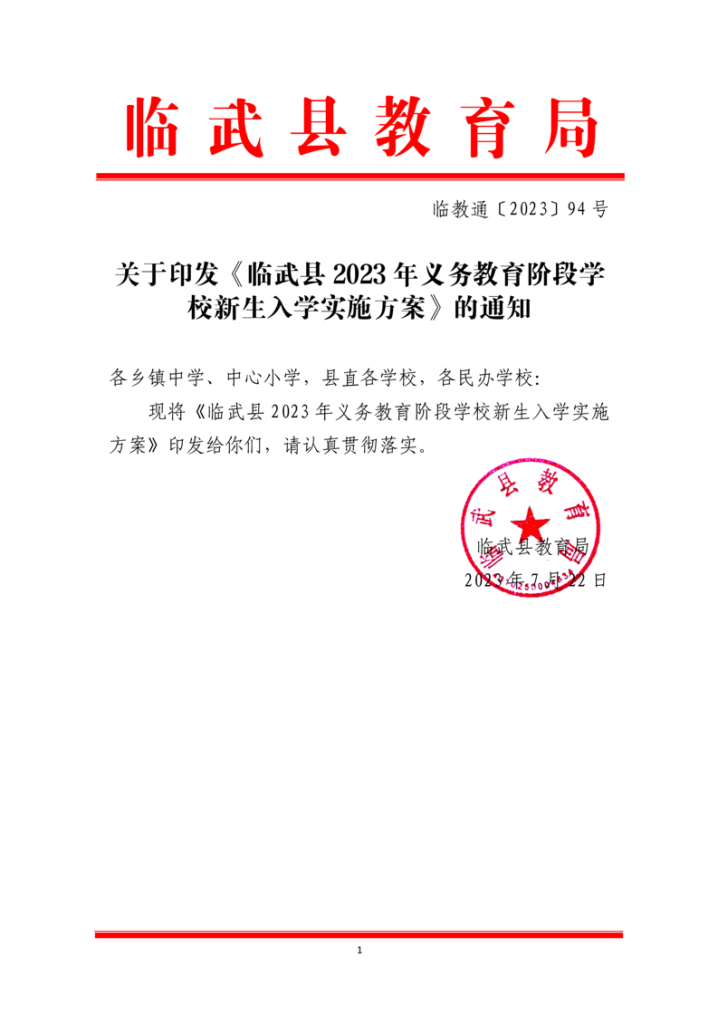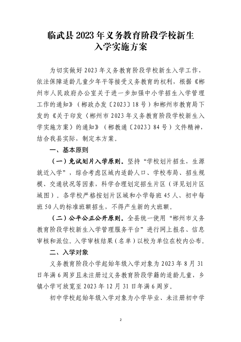 临武县 2023 年义务教育阶段学校新生 入学实施方案