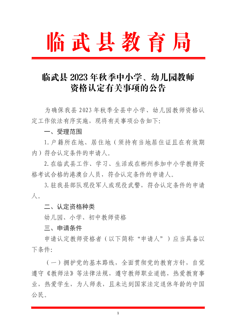 临武县 2023 年秋季中小学、幼儿园教师 资格认定有关事项的公告