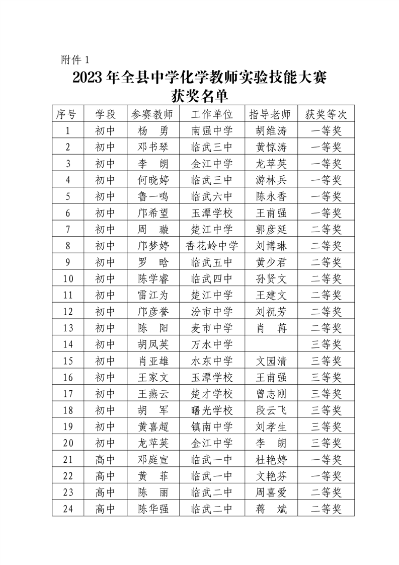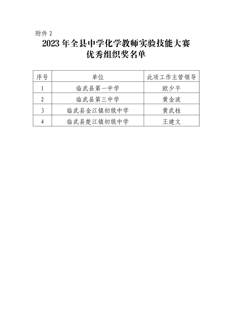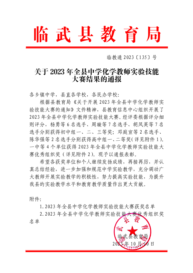 关于2023年全县中学化学教师实验技能大赛结果的通报