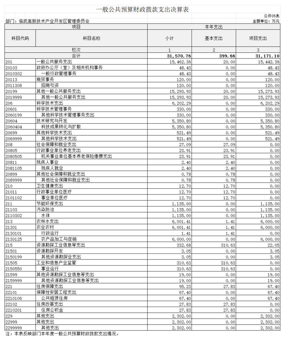 2023年度财政拨款支出31570.76万元,主要用于以下方面:一般公共服务支出15462.36万元,占48.98%;科学技术支出6202.29万元,占19.65%;社会保障和就业支出27.1万元,占0.09%;卫生健康支出12.7万元,占0.04%;节能环保支出1135万元,占3.6%;农林水支出6001.41万元,占19.01%;资源勘探工业信息等支出332.67万元,占1.05%;住房保障支出95.23万元,占0.3%;其他支出2302万元,占7.28%。