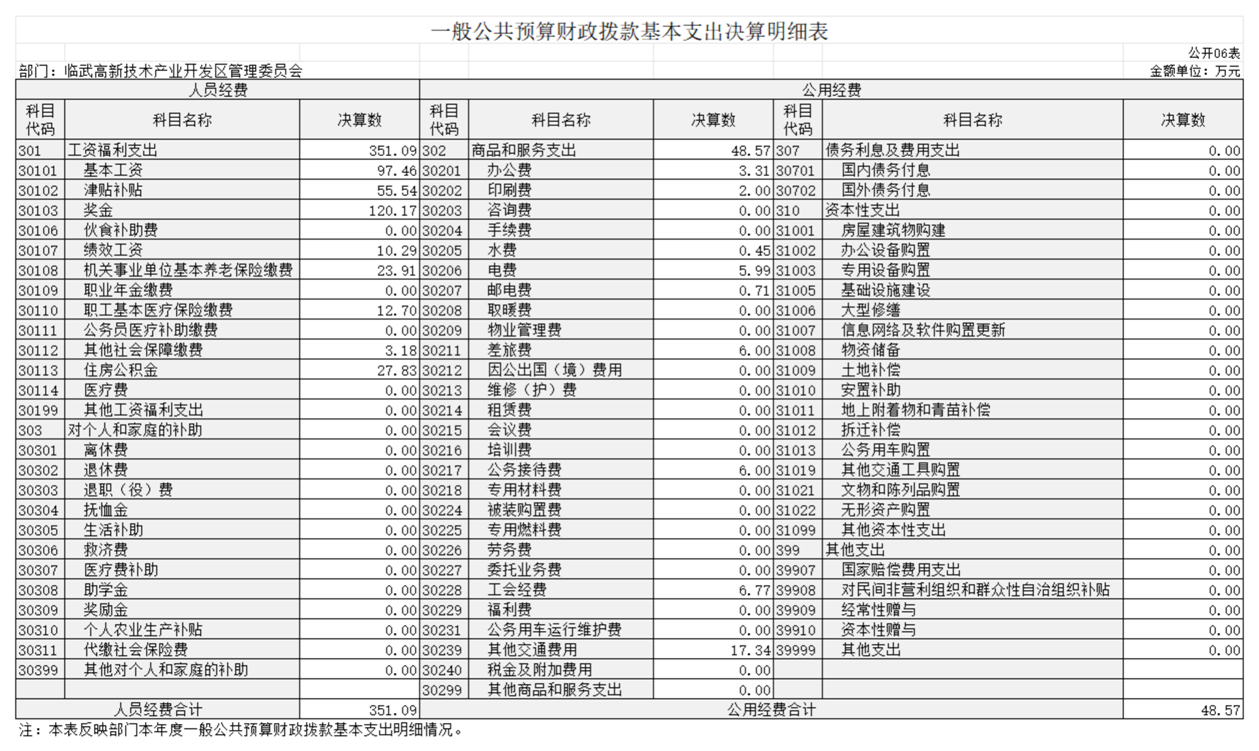 公用经费48.57万元,占基本支出的12.15%,主要包括办公费3.31万元、印刷费2万元、水费0.45万元、电费5.99万元、邮电费0.71万元、差旅费6万元、公务接待费6万元、工会经费6.77万元、其他交通费用17.34万元。