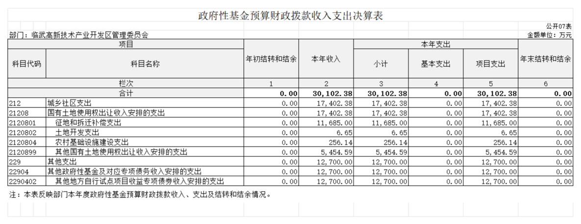 2023年度政府性基金预算财政拨款收入30102.38万元;年初结转和结余0万元;支出30102.38万元,其中基本支出0万元,项目支出30102.38万元;年末结转和结余0万元。具体情况如下: