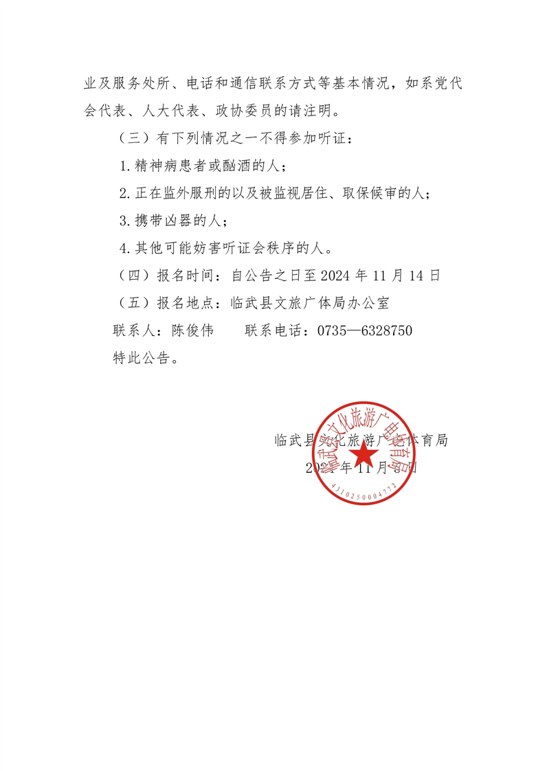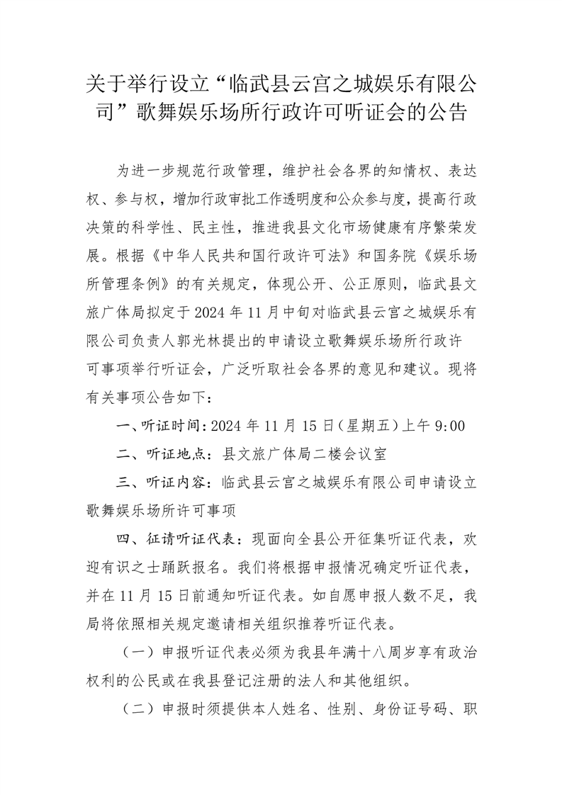 关于举行设立“临武县云宫之城娱乐有限公司“歌舞娱乐场所行政许可听证会的公告