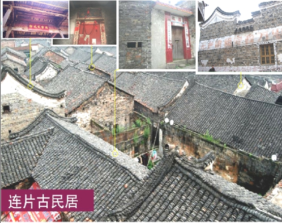 古建筑分为群体连贯和单体组合两类。群体以上下厅、天井、对称式和庭院三合式组合,多为祠堂、祖厅、大宅三至五栋连贯结构建筑;单体为单立式、并排式散形组合。古建为青砖墙体,硬山顶或马头墙硬山顶,小青瓦,青石围角和石砌门坎,四墙三间、三墙二间不等。古建筑大门两边侧墙都有石灰抹墙永久性诗词对联,内部结构多为木柱梁架、窗式隔房、木楼板下吊顶棚不等,大小窗户、神台、隔门、檐翘梁等木质结构多为木雕花卉、动物图案和外部檐下墙壁书画、花卉石灰浮雕图案装饰。古建筑青石围角、门坎石、天井石都有浮雕八卦、动物图案石刻。古民居保留有清、民国时期家具。
