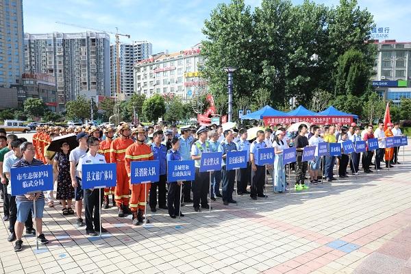6月17日上午,临武县人民政府组织县公安局、应急管理局、消防大队、交警大队等18家单位在舜峰广场开展以“防风险、除隐患、遏事故”为主题的“安全生产月”宣传咨询日活动。县委副书记、县长刘杨,副县长蒋中平出席活动。