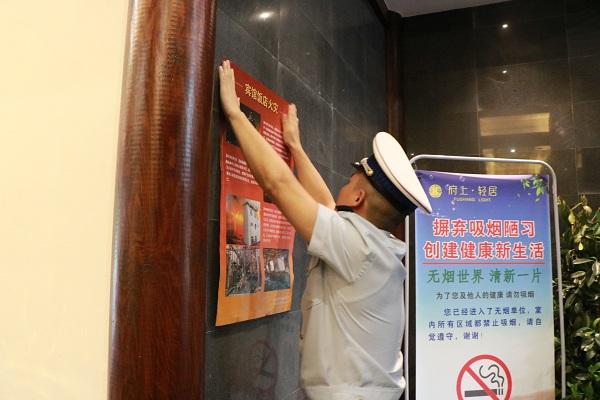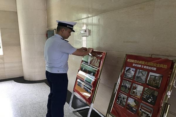 此次张贴宣传挂图工作,大队宣传人员深入商场市场、宾馆饭店、养老院、劳密企业、高层建筑、公共娱乐场所等9类场所进行张贴。在张贴过程中,大队宣传人员针对不同场所的安全风险防范要点,教育引导广大居民群众充分认识到火灾的危害以及成因,并讲解了消防基本常识,使广大社会单位、群众在无形中接受消防教育、学习消防知识,增强群众的消防安全责任意识,提高防火自救能力。同时,大队监督人员要求各单位要深刻认识到做好火灾预防工作的重要性,尤其是在坚决消除9类突出问题的消防安全管理工作中,自评自查安全风险隐患,确保消防工作万无一失。