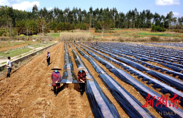 (2月13日,宁远县湾井镇田心村,农民在烟田施肥、覆盖地膜。该县将疫情防控工作与春耕生产同部署、同安排,通过送技术、送信息进村入户,引导农民不误农时,整地施肥,有序开展春耕生产。乐水旺 摄)
