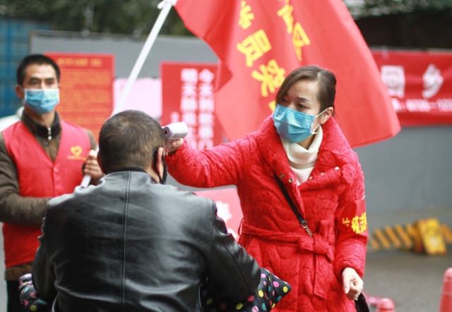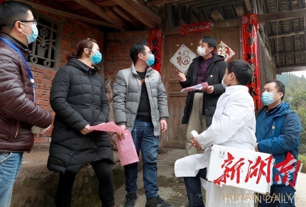 ( 2月2日,通道侗族自治县双江镇竹塘村,由联村单位人员、包村镇干部、驻村帮扶工作队、村支两委及医护人员组成的防控小分队,上门为武汉返乡的村民监测体温。 刘强 左茜 摄)
