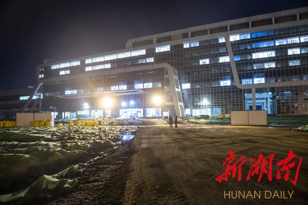 (2月16日晚10时,湖北省黄冈市大别山区域医疗中心灯火通明。这里是黄冈市新冠肺炎集中收治点,湖南支援黄冈医疗队一队和二队,540余名医护人员在此并肩战斗,与时间赛跑,与病魔竞速。 湖南日报·新湖南客户端记者 辜鹏博 摄)