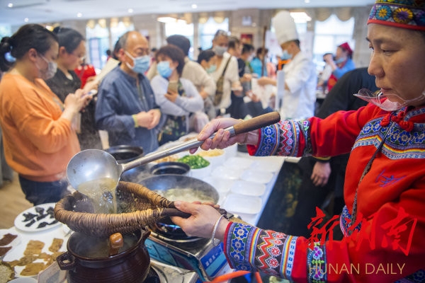(4月15日,湖南九所宾馆,来自江永县的瑶族大姐现场制作油茶。当天,是“湖南米粉大擂台”开赛的第二天,14个市州特色米粉和小吃受到众多市民的喜爱。 湖南日报·新湖南客户端记者 唐俊 摄)