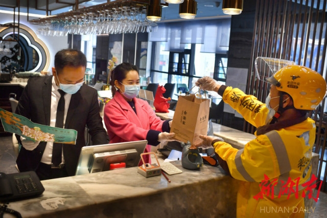 (3月19日,长沙市雨花区湘府东路食鉴家,配送员在取餐。受疫情影响,实体餐饮企业遭遇销售“瓶颈”。不少企业通过线上、外卖服务,实现了销售增长。湖南日报·新湖南客户端首席记者 郭立亮)