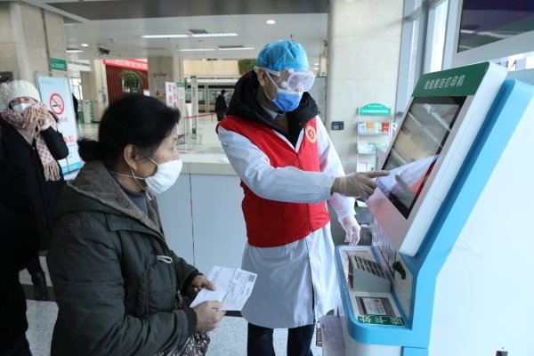 (1月30日,南华大学附属南华医院志愿者在帮助病人自助打印化验单。乐彦麟 唐兰荣 摄)