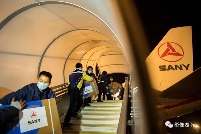 (2月5日晚,长沙黄花国际机场,三一集团用公务机从阿联酋运回4.2万套医用防护服,支援防控新型冠状病毒感染的肺炎疫情。湖南日报·新湖南客户端记者 唐俊 摄)