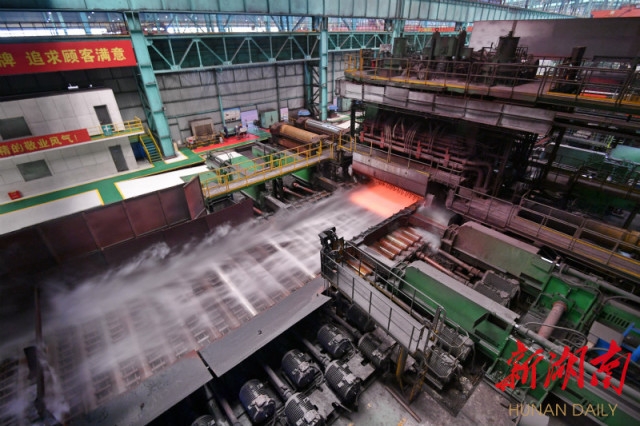 (2月24日,湖南华菱湘潭钢铁有限公司5米宽厚板厂,全自动化生产线正在加紧生产。目前,该公司订单火爆,生产经营稳定有序,铁、钢及钢材产品的产量均高出预期水平。湖南日报·新湖南客户端记者 童迪 摄)