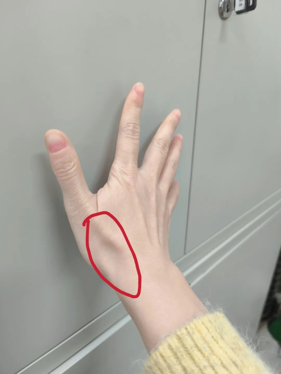 这个穴位在我们手腕上,当你将大拇指向上轻微地翘起的时候,可以感到有一个明显的凹陷,这个凹陷叫做鼻咽凹。