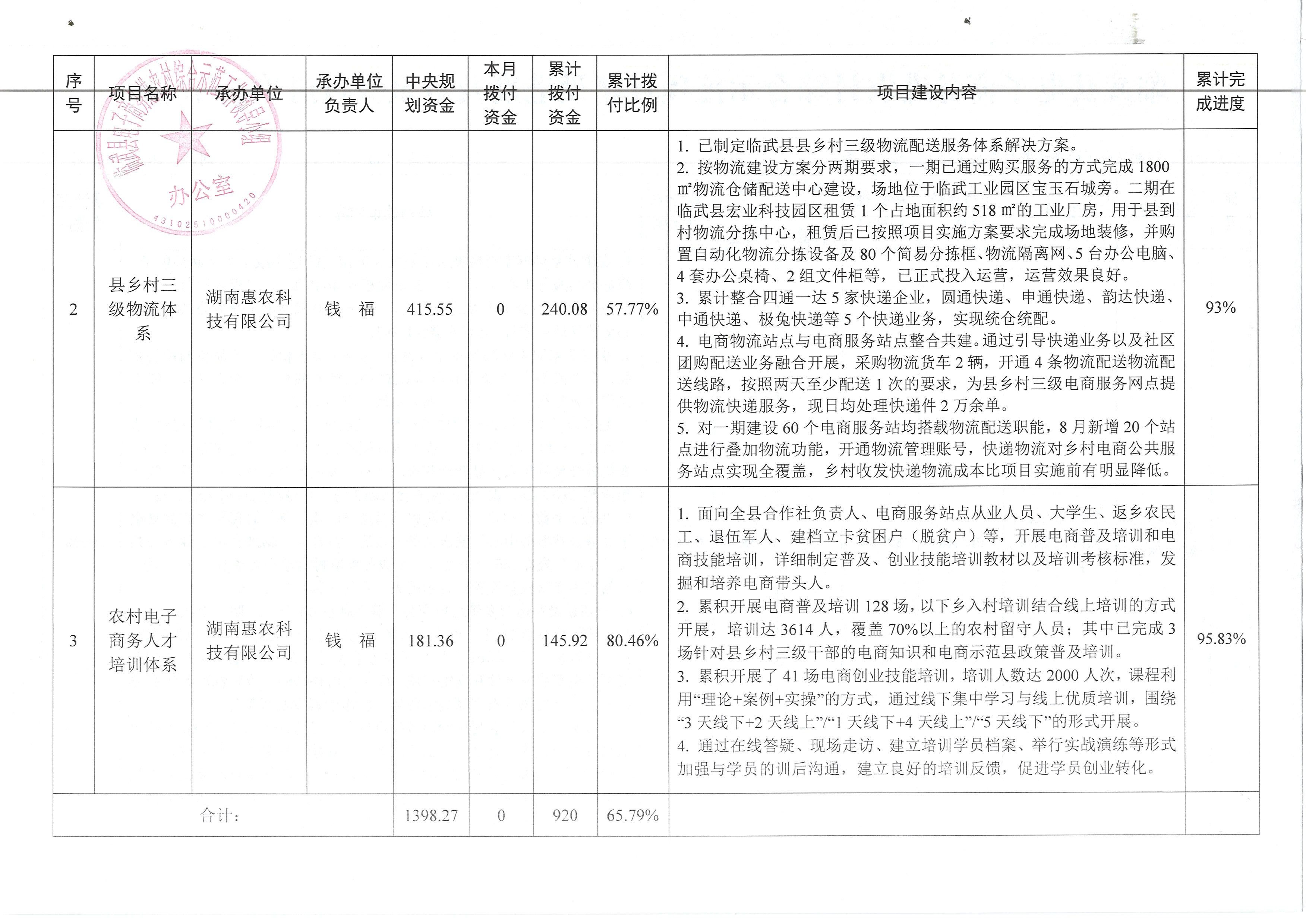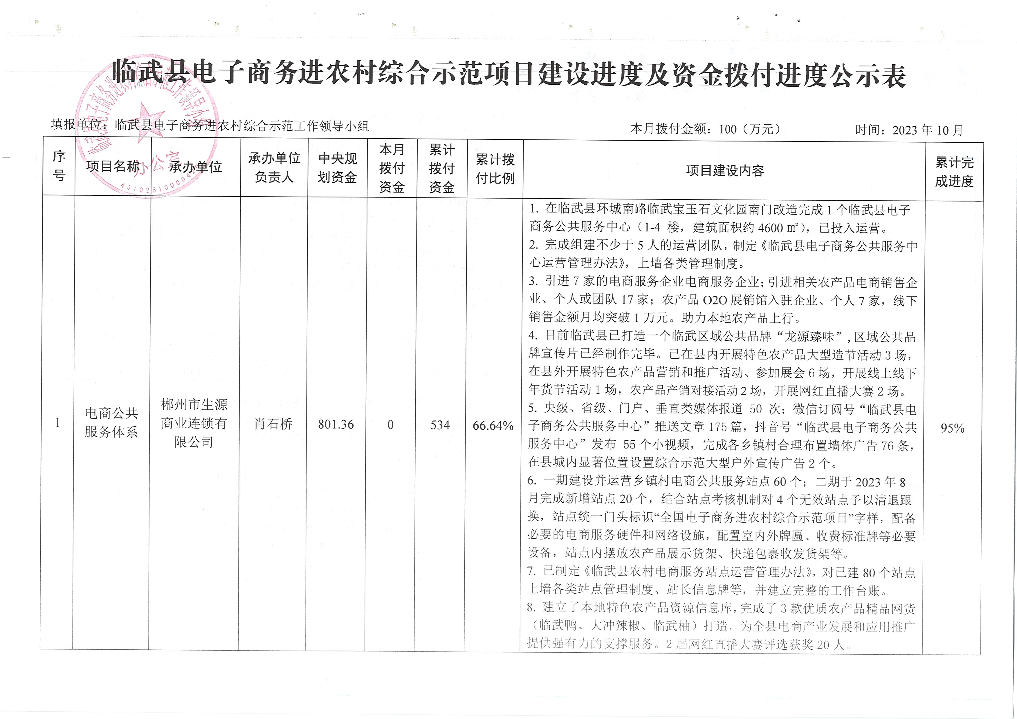 临武县电子商务进农村综合示范项目建设进度及资金拨付进度公示表(2023年10月)