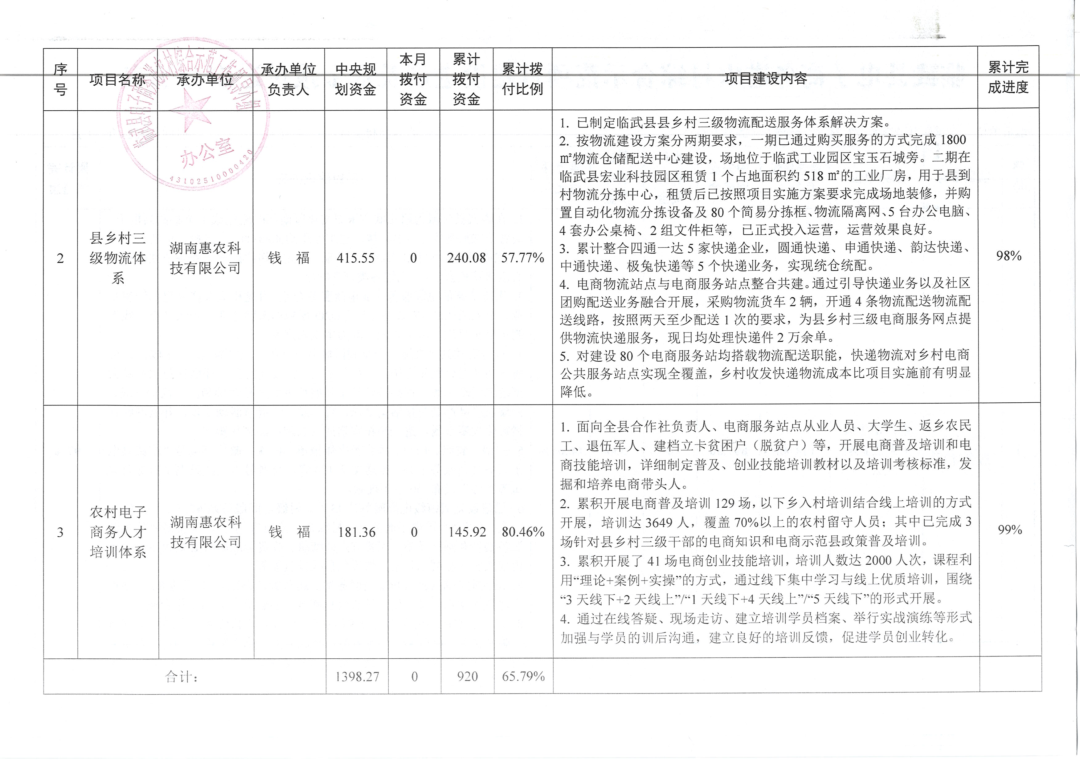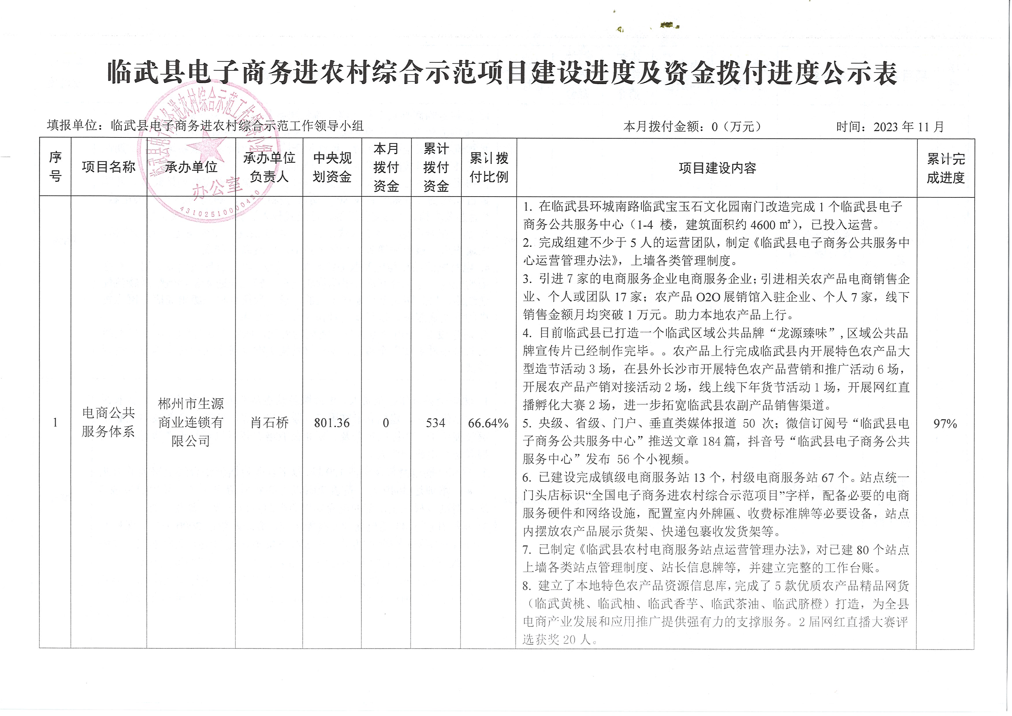 临武县电子商务进农村综合示范项目建设进度及资金拨付进度公示表(2023年11月)